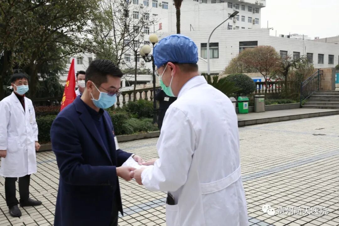 医院院长冯春林向内科一党支部授予了“贵州航天医院内科一党支部抗击新冠疫情先锋队”队旗。
