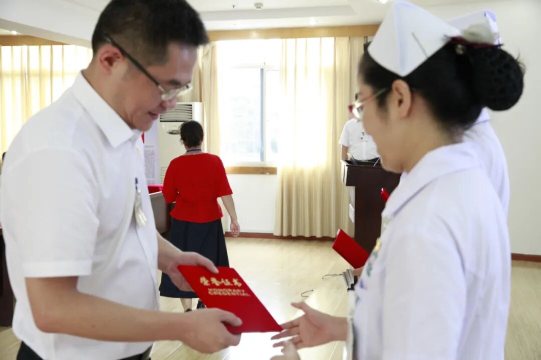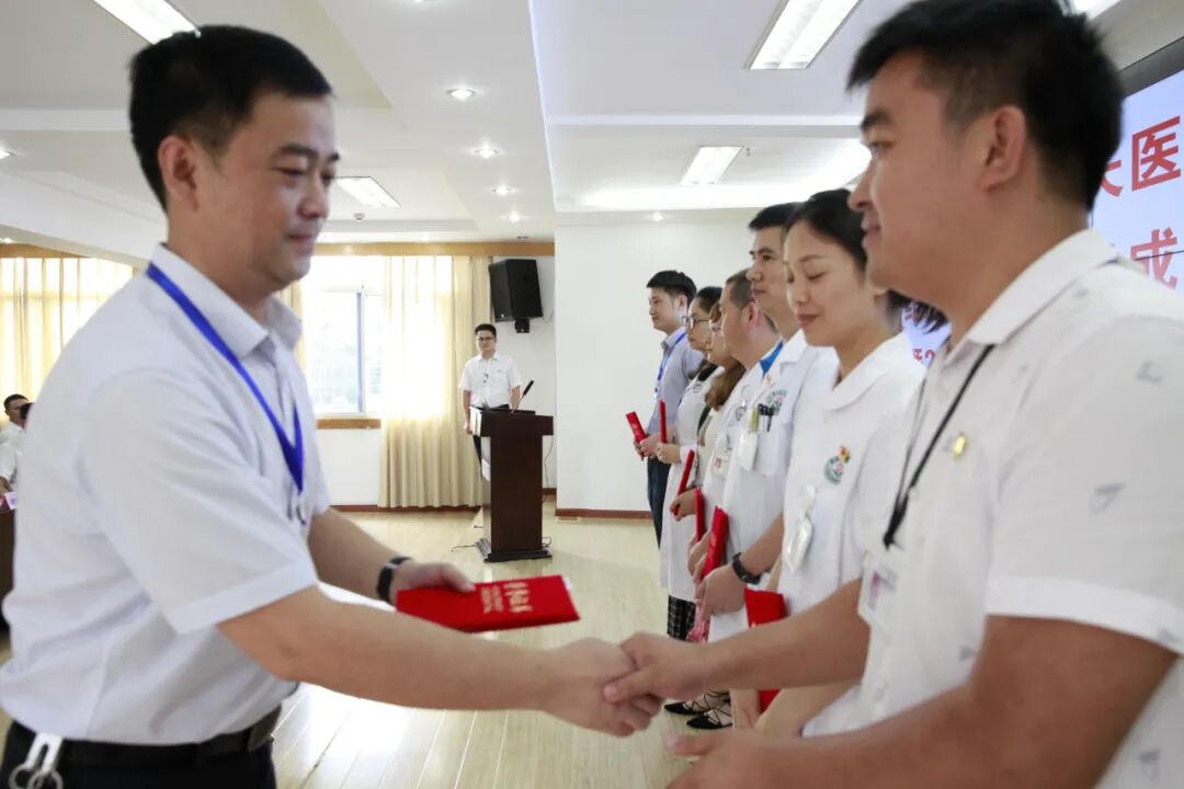 党委委员、副院长杨晓军宣读了医院党委表彰决定。在热烈的掌声中,荣获医院先进党支部称号的外科系统第一党支部、内科系统第一党支部2个支部代表,荣获优秀党务工作者称号的付立霞、冯远军、张璇、向家祥4位同志,以及荣获优秀共产党员称号的罗柱文等23位同志,抗疫援外优秀共产党员称号的马光凤等10位同志依次上台领奖,接受表彰。