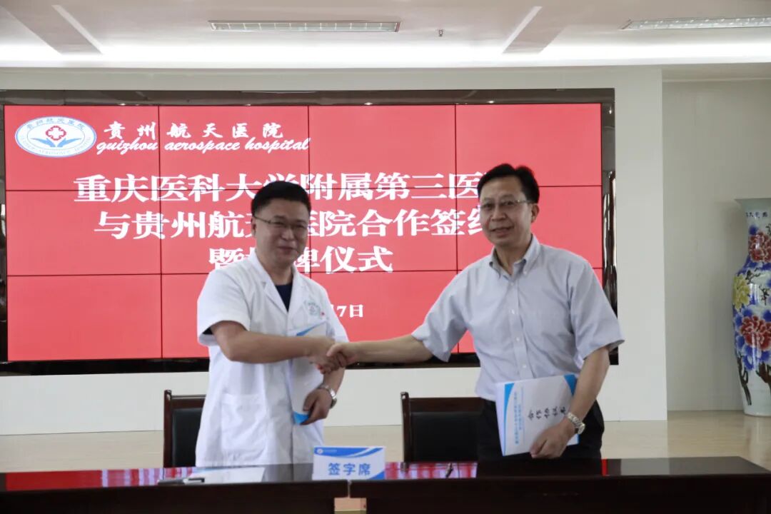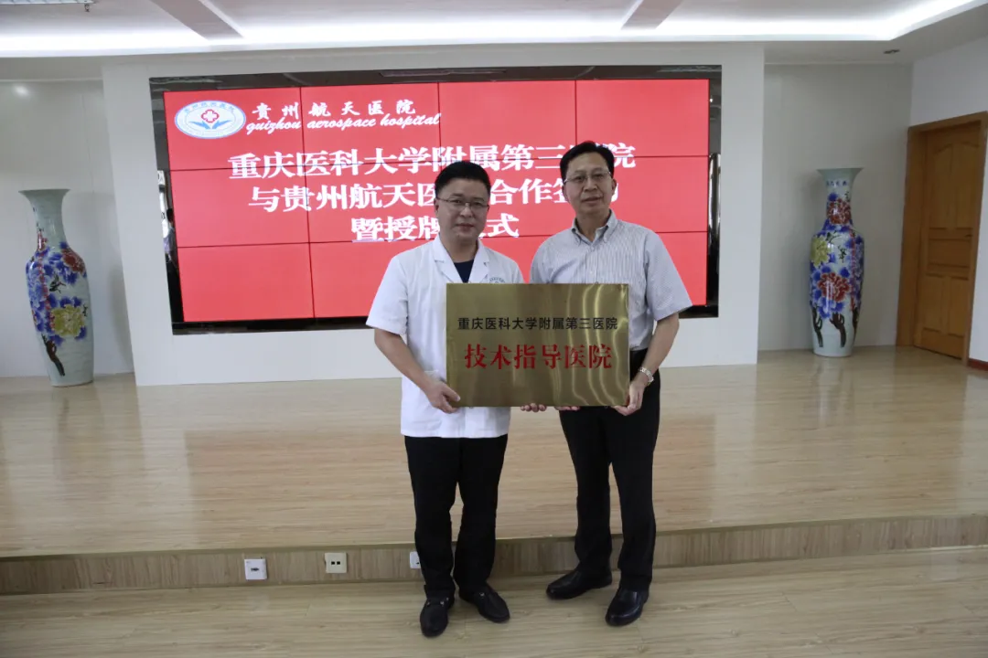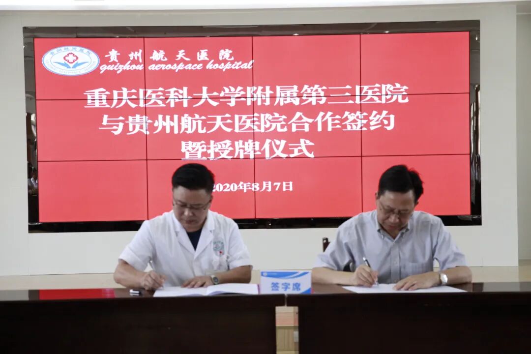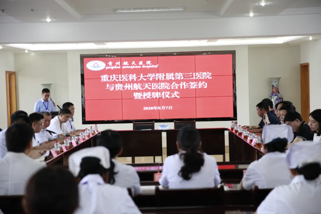 8月7日,重庆医科大学附属第三医院院长傅仲学一行莅临航天医院指导工作并出席两院合作签约暨授牌仪式,遵义市卫健局党委委员、市计生协会副会长张辉杰出席会议并讲话,重医三附院部分职能科室管理人员、临床科室专家,航天医院院班子成员、各临床医技科室主任、护士长、行政职能部门负责人参会,会议由党委书记段永华主持。