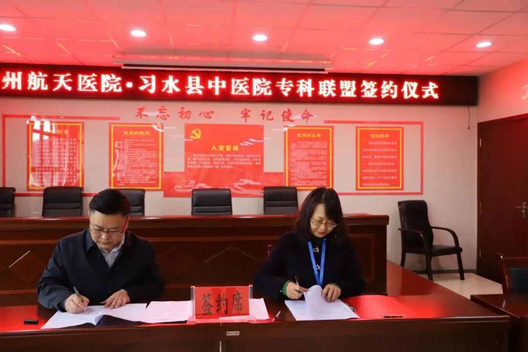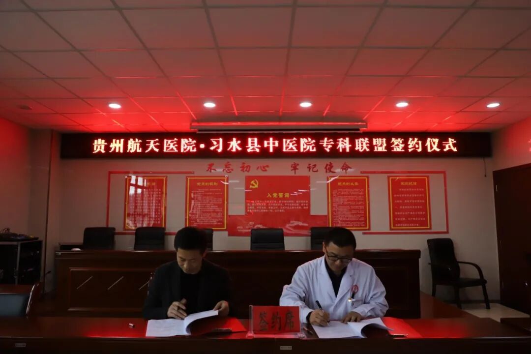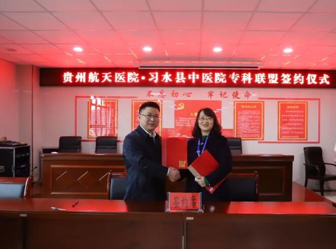 签约仪式上,双方医院主要领导分别介绍医院情况及专科联盟合作事宜,共同签订《贵州航天医院与习水县中医院签订卒中中心、胸痛中心协同救治及培训协议》、《贵州航天医院与习水县中医院签订呼吸及呼吸危重症专科联盟》、《贵州航天医院与习水县中医院签订医联体学科联盟技术合作协议》,与会领导共同为习水县中医院呼吸及呼吸危重症专科联盟单位授牌。