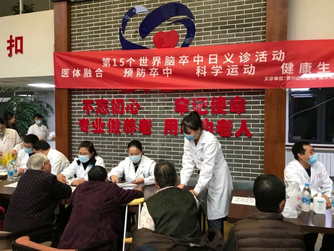 10月29日,在第15个“世界卒中日”来临之际贵州航天医院红手环志愿者服务团积极响应号召,我院联合遵义尊爱医院在康宁世纪养护院开展以 “医体融合,预防卒中”为主题的大型义诊活动。活动旨在提高广大群众对卒中危害的认知程度,主动防控脑卒中的意识,以及“时间就是大脑”的及早就诊理念。