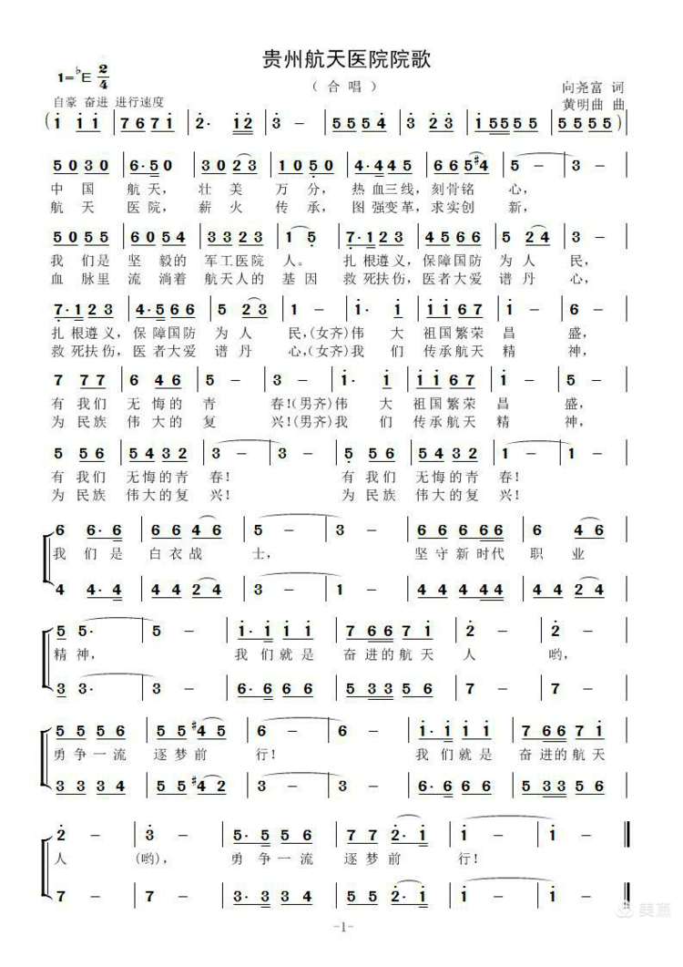 贵州航天医院自建院52年以来,全体医务人员及干部职工团结一心,积极向上,以救死扶伤和甘于奉献为使命,为传承航医精神,保障当地人民的健康提供有力的医疗保障。此次院歌发布前期多次进行推敲琢磨,结合我院历史沿革、精神文化、改革发展,移交遵义市政府管理为背景进行了创作,让我们更加凝心聚力、斗志昂扬,心怀航医荣光,在实现美好中国梦的道路上继续奋进! 创作说明:《贵州航天医院院歌》是在贵州航天医院党委书记段永华、院长冯春林、分管领导及部分员工和词作者向尧富、曲作者黄明曲通过多次交流沟通修改,又多次试唱润色创作而成。歌词精炼,信息量大,时间跨度长,旋律节奏感强,雄壮有力而又不乏优美抒情。既展示了中国航天精神的壮美豪情,又突出了热血三线的无私奉献精神,还唱出了贵州航天医院人以历史为荣、薪火传承、求实创新、牢记使命、不忘初心的决心,勇争一流逐梦前行、医者大爱谱丹心的信心!院歌创作征集以来,得到了广大音乐爱好者的大力支持。在此,也向为歌曲创作辛勤付出的其他创作人表示衷心的感谢! 《贵州航天医院院歌》是航天医院的第一首录音单曲,用音乐诠释航医人、军工医院人、热血三线建设者们几代人的辛劳付出和艰苦卓绝的贡献精神,记录着航医人在黔区这片土地上的热血和荣光,于2020年11月17日发行,实体单曲在现收听播放。