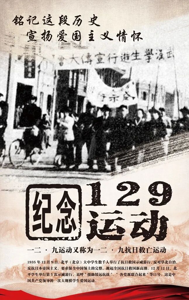 “九·一八事变”后,日本帝国主义占领了东北,接着又向华北发动了新的侵略。1935年下半年,日本帝国主义发动华北事变,进一步控制察哈尔,并指使汉奸殷汝耕在冀东成立傀儡政权。国民党政府继续坚持不抵抗政策,竟准备于12月成立冀察政务委员会,以适应日本帝国主义提出的华北政权特殊化要求。失地丧权,亡国灭种的大祸迫在眉睫。12月9日,在中共北平临时工作委员会的领导下,北平爱国学生6000余人,高呼“停止内战,一致对外”、“打倒日本帝国主义”等口号,举行了声势浩大的抗日救国示威游行。国民党政府出动大批军警镇压,30多人被捕,数百人受伤。10日,北平各校学生宣布总罢课。在“冀察政务委员会”计划成立的12月16日,北平学生和各界群众1万余人又举行示威游行,迫使冀察政务委员会延期成立。之后,天津学生又组成南下扩大宣传团,深入人民中间宣传抗日救国。杭州、广州、武汉、天津、南京、上海等地相继举行游行示威。北平学生的爱国行动,得到了全国学生的响应和全国人民的支持,形成了全国人民抗日民主运动的新高潮,推动了抗日民族统一战线的建立。一二·九运动公开揭露了日本帝国主义侵略中国,并吞华北的阴谋,打击了国民党政府的妥协投降政策,大大地促进了中国人民的觉醒。它配合了红军北上抗日,促进了国内和平和对日抗战。它标志着中国人民抗日民主运动新高潮的到来。正如毛泽东所指出的,一二·九运动“是抗战动员的运动,是准备思想和干部的运动,是动员全民族的运动”,“有着重大的历史意义”。