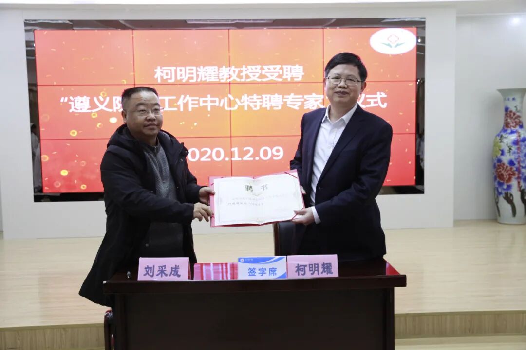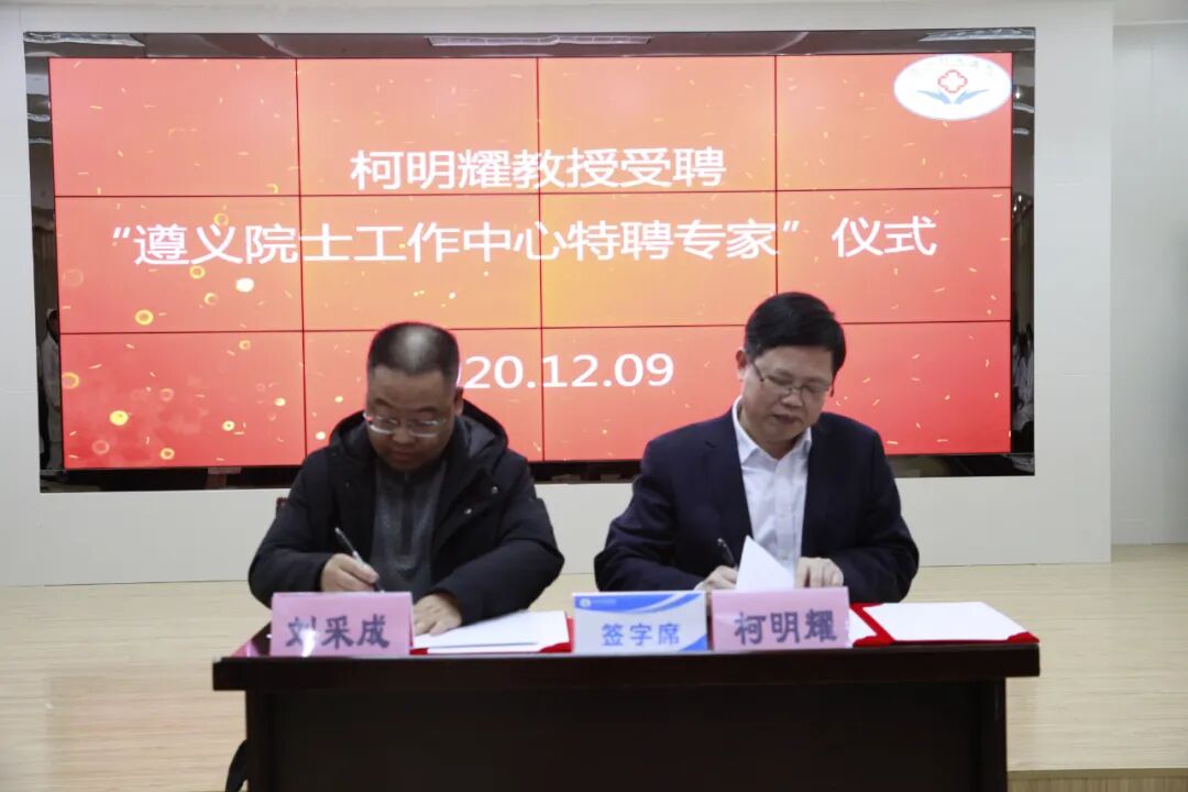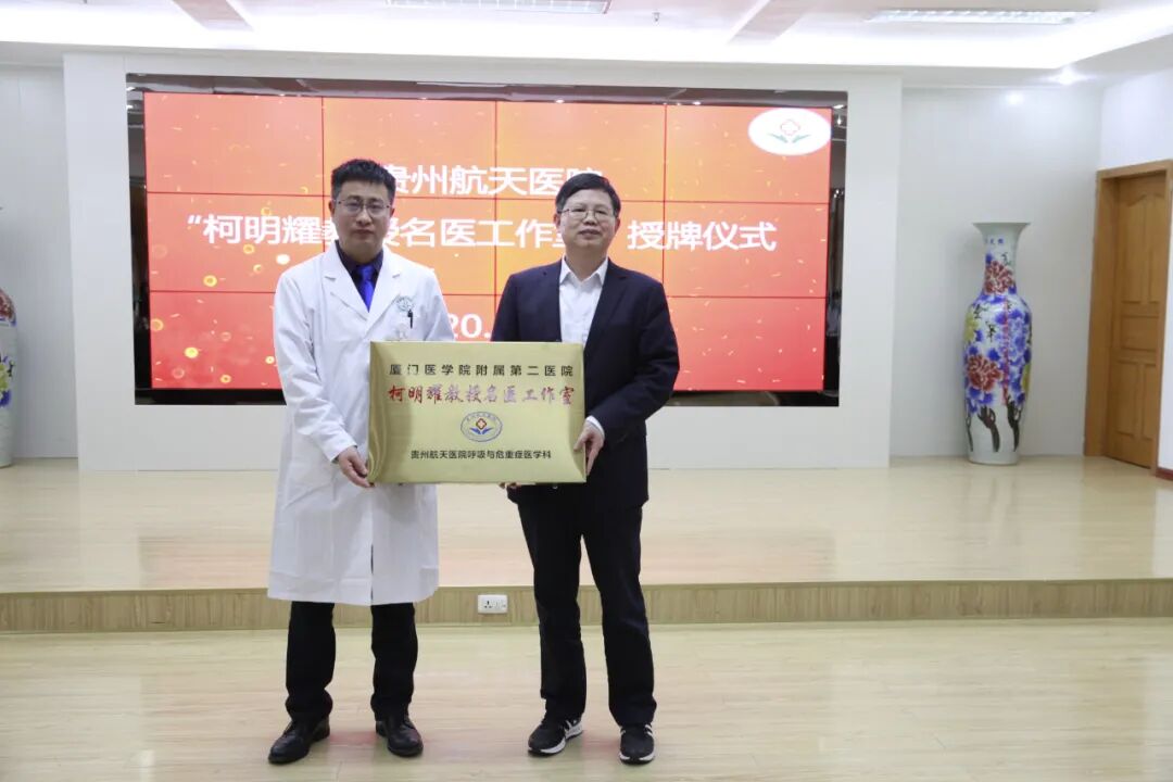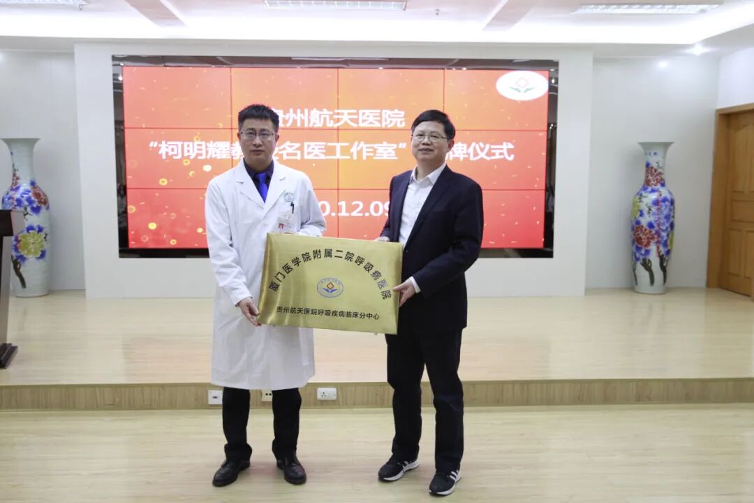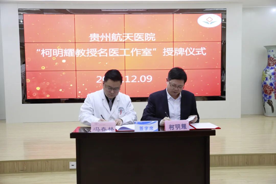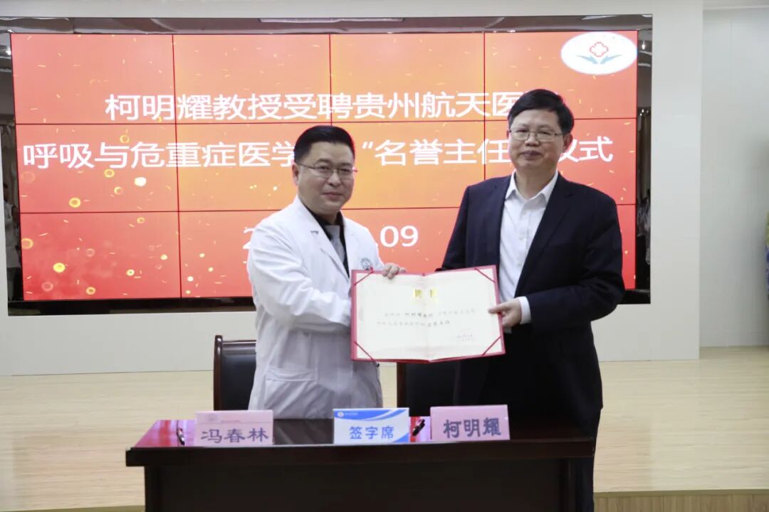 贵州航天医院院长冯春林与厦门医学院附属二院呼吸病医院执行院长柯明耀教授签订“聘任柯明耀教授为贵州航天医院呼吸与危重症医学科名誉主任”协议并颁发聘书。