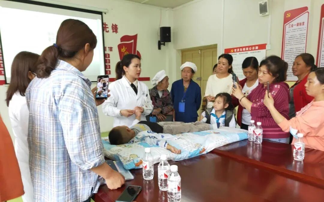 义诊现场,我院驻点帮扶医务人员娄会会、任星在毛石镇卫生院中医馆免费为患者提供小儿推拿诊疗服务,为广大家长及儿童提供咨询指导、答疑解惑。下午,两院联合医护团队至毛石镇中心幼儿园开展了以“小儿推拿的临床应用”、“如何科学育儿”为专题的健康宣讲,为家长们提供了小儿推拿、健康指导、发热知识等内容,并现场为示范了小儿常见症状的推拿穴位、常用手法。