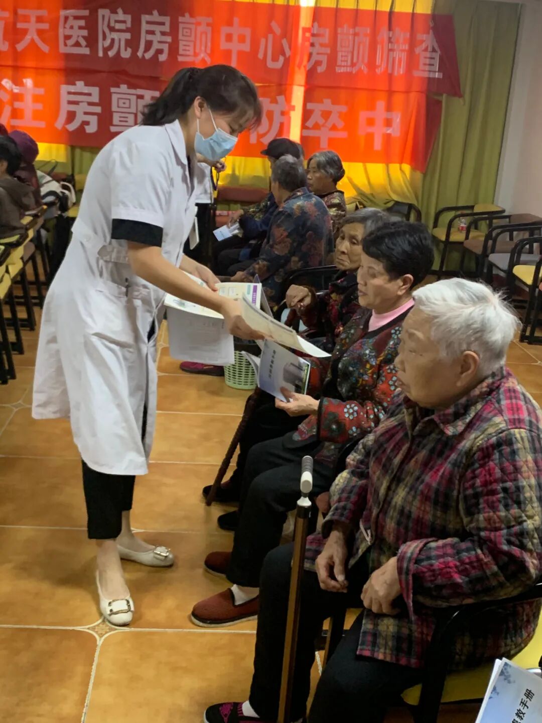 义诊现场,心血管内科医护人员们细心地老年人免费测量血压、心电检查、健康体检,解答疑惑,并做出相关检查建议,并同时发放房颤相关宣讲手册。随后,我院心内科副主任医师张羽坤以《正确认识隐形的杀手—心房颤动》为题开展了健康宣教,通过通俗易懂的语言和幻灯片,为大家讲解了什么是房颤、房颤的类型、抗凝药物的使用等内容,同时教会大家辨别房颤表现形式,如何自测脉搏以便早期发现房颤。