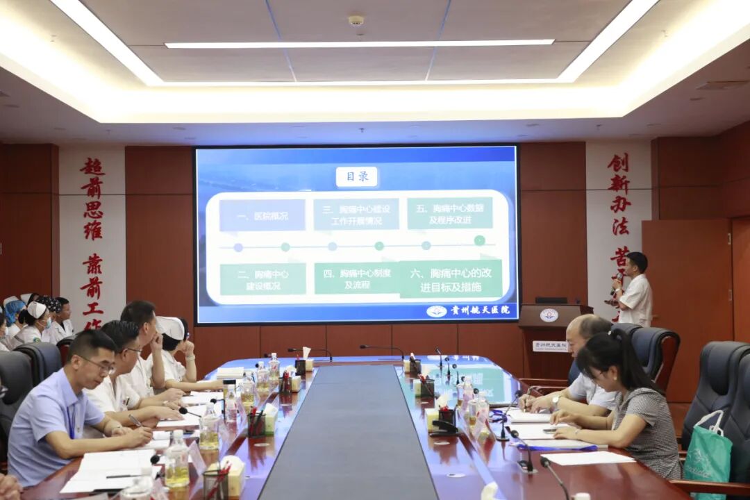 贵州航天医院胸痛中心医疗总监沈万贵从我院胸痛中心建设工作开展建设情况、数据及程序改进、制度流程、改进目标及措施等方面进行详细汇报。