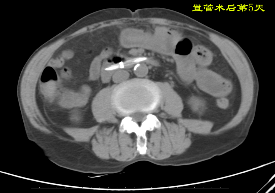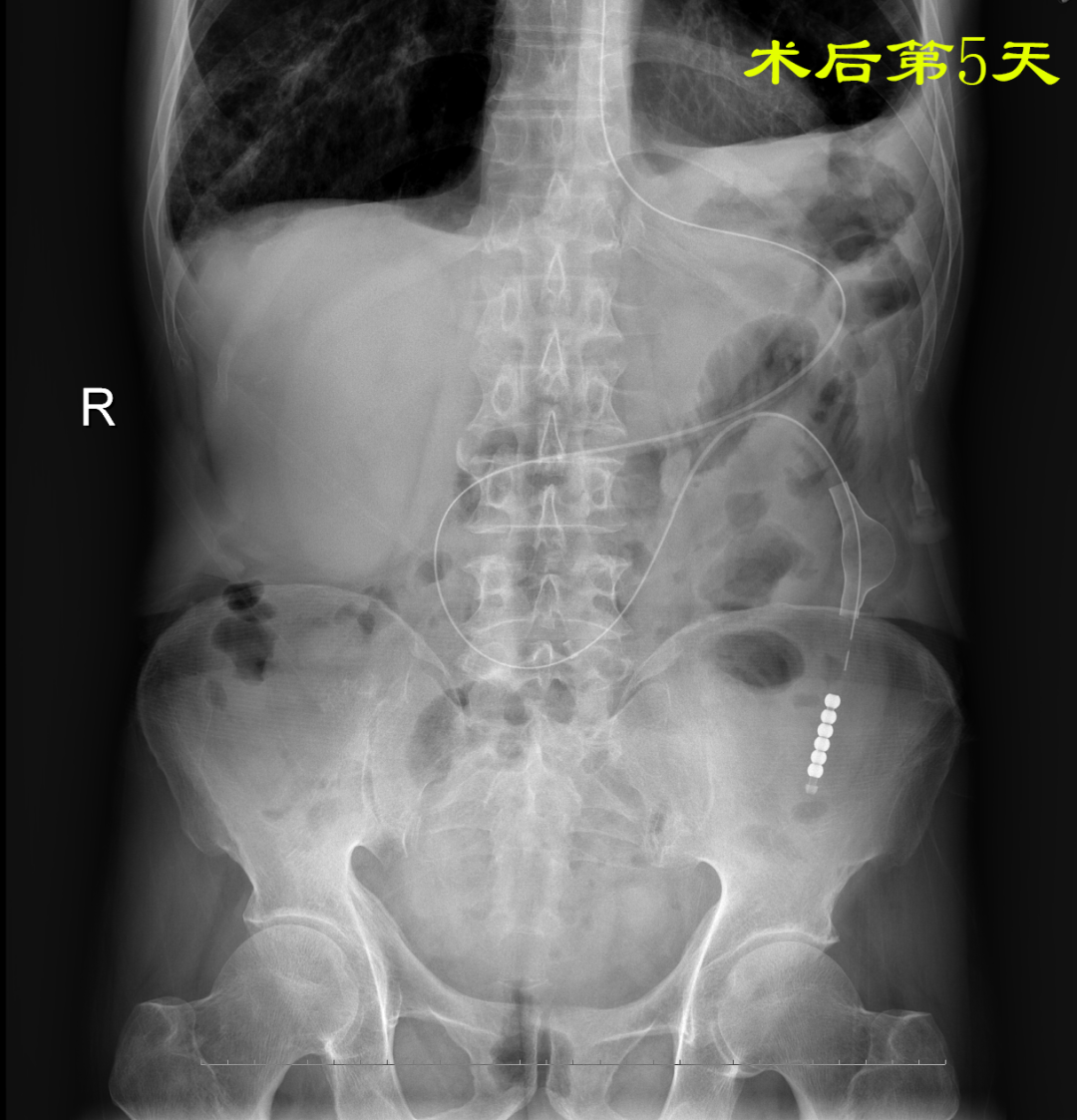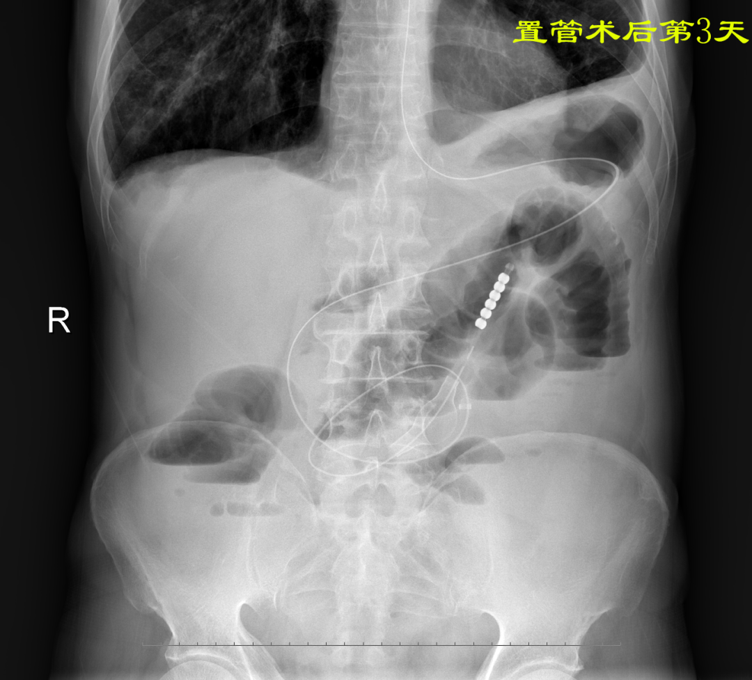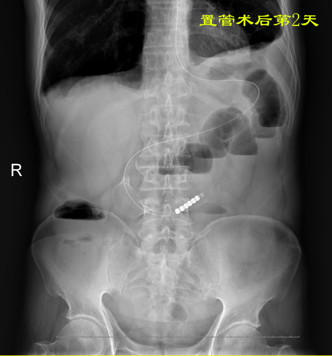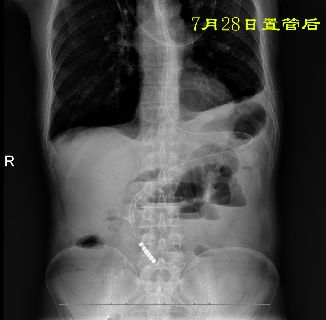病例:患者男性,74岁,因“腹痛、腹胀伴呕吐、肛门停止排气排便20小时”于2021年7月24日入住我院普外科。患者1月前因回肠穿孔于我院普外科手术治疗,入院后明确诊断为术后粘连性小肠梗阻,经胃管引流等保守治疗无好转。因患者有严重心肺疾患,再次手术风险较大,并且术后再发粘连性肠梗阻的可能性也很大。经过与患者家属沟通后,最后决定采用胃镜引导下置入经鼻插入型肠梗阻导管技术来治疗肠梗阻。由我院消化内科副主任医师杨开余完成操作,耗时大约40分钟,患者术后第5天开始排气排便,腹痛、腹胀症状迅速消失,术后第7天拔除肠梗阻导管,恢复饮食。拔管至今已10天,患者已出院。随访患者无腹痛、腹胀,排便正常。