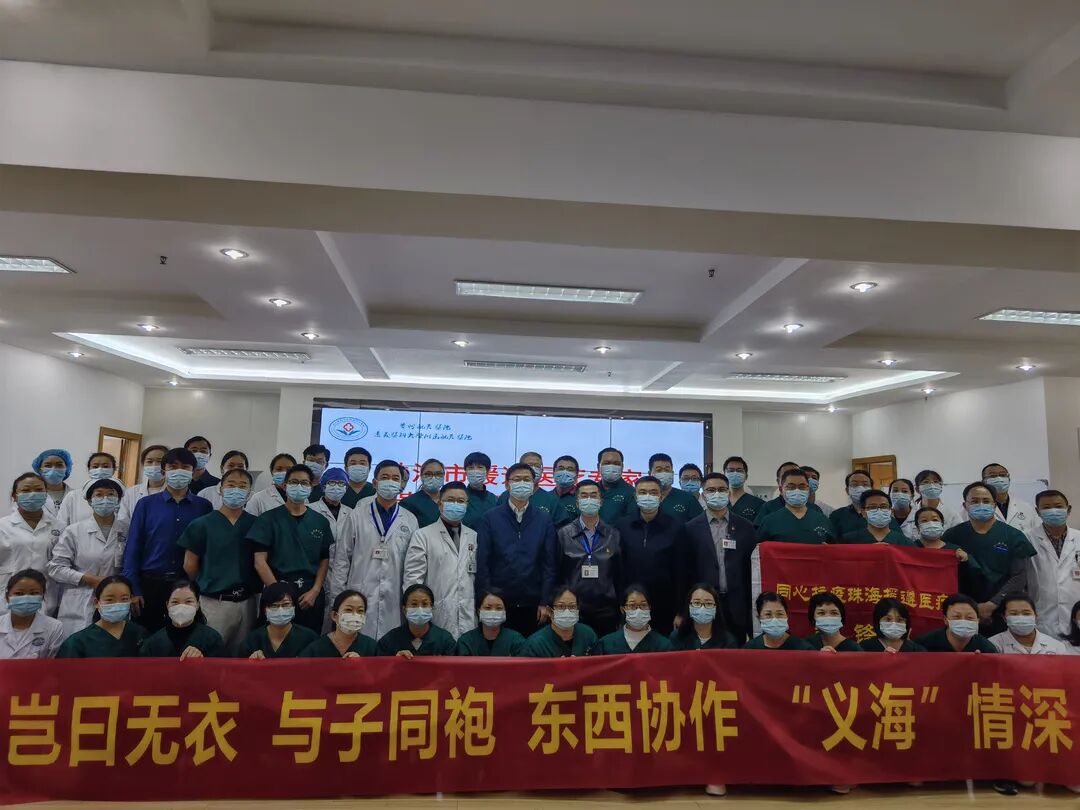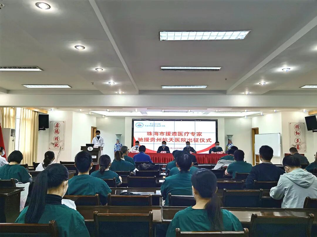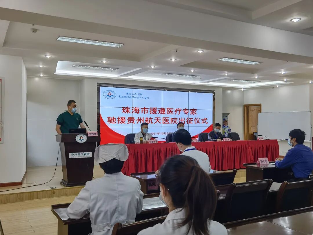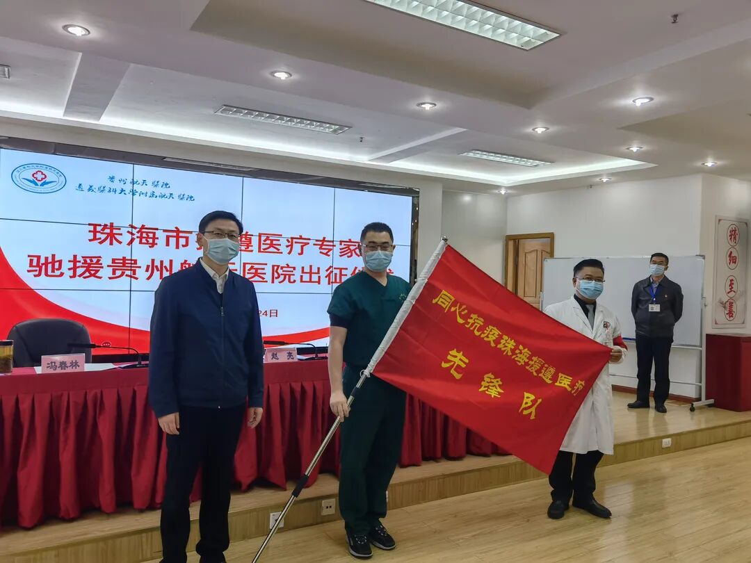 10月24日上午,珠海市援遵医疗专家驰援贵州航天医院出征仪式在贵州航天医院举行,在短暂集结及授旗后,医疗队分组出发,立刻投入“四天三检”的全员核酸检测工作。 作为东西部协作的兄弟城市 珠海和遵义“义海”情深 据了解,自10月19日遵义市出现首例确诊病例以来,珠海市高度重视,立即组织了22家医疗机构的38名专家奔赴汇川参与防疫工作,这些专家,同时也是分布到遵义市8个县市的帮扶医疗队员。 “大家报名后,我们成立了8支珠海援助遵义医疗队,根据队员的专业,他们将分别走进发热门诊、隔离病房、社区等开展全员核酸检测工作。希望通过我们珠海医疗队的共同努力,为遵义早日战胜疫情贡献一份力量。”珠海市人民医院医务科主任、珠海市援遵医疗队队长褚靖告诉记者,曾被中宣部授予“最美支边人”称号的“背篓医生”管延萍也在其中。 管延萍来自珠海市金湾区红旗镇卫生院,到赤水市长沙中心卫生院对口帮扶已经2个月了。 “昨天在看到珠海驻遵义工作组的号召后,我就立刻报名了。我们5名医生自驾赶过来花了5个半小时。我们也没想太多,只是觉得应该到这里来做点我们能做的。”管延萍说,医疗队医生大多都有全员核酸检测工作经验。 “在医护人员紧缺的情况下,珠海市援遵医疗队来了,医疗队所有人员均已进行穿脱防护服、核酸采集注意事项专题培训。相信新鲜血液的注入,定能帮助我们早日完成全员核酸检测任务。”贵州航天医院副院长张伟德说。