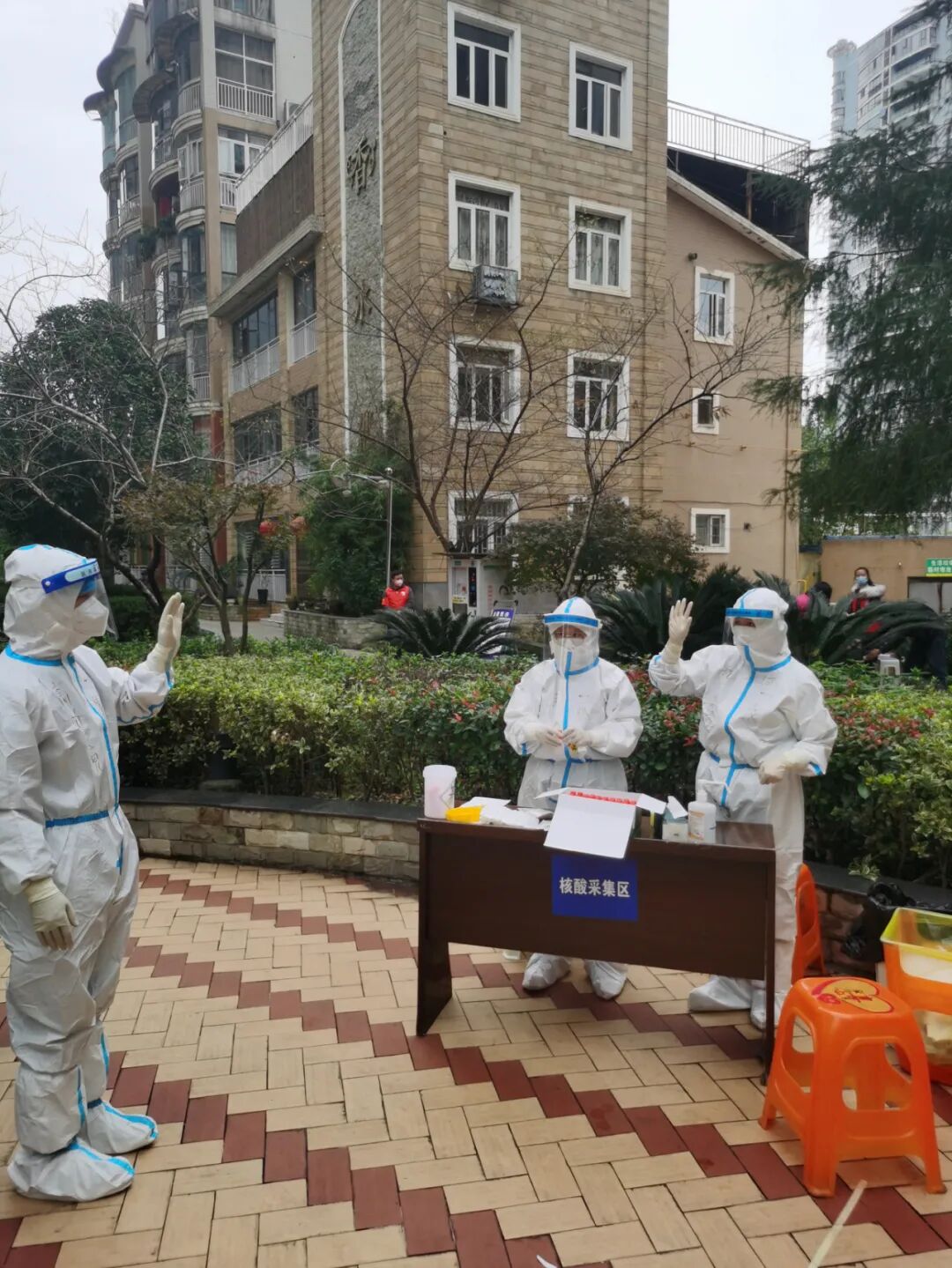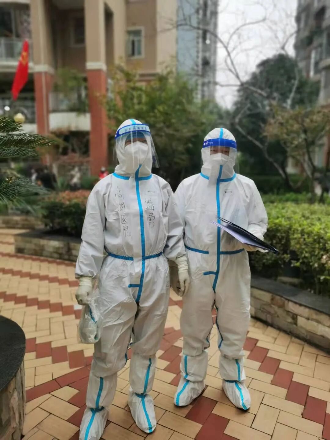 23日,夫妻俩在香水郡核酸检测点相遇,互相看了对方一眼,挥手示意为对方“加油”,转身继续奔赴在各自的岗位上。25日,两人再次相遇,却没认出对方。他们笑称“穿着防护服没认出对方,走近一看才知道”。