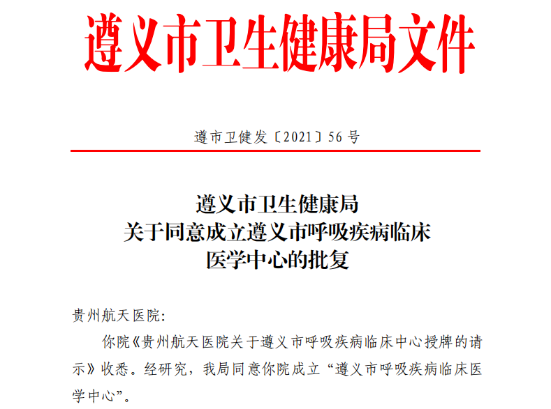 同时,遵义市卫生健康局批准贵州航天医院成立“遵义市呼吸疾病临床医学中心”。