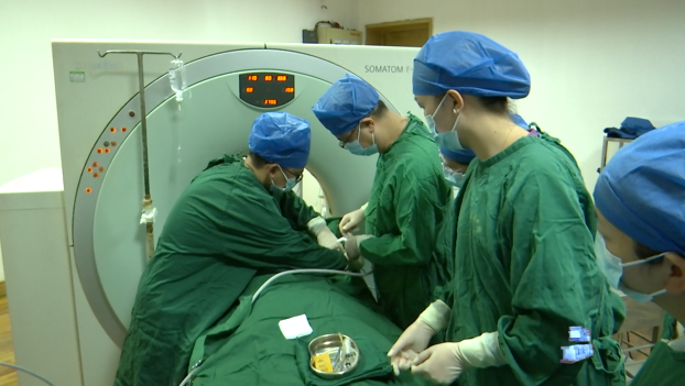 贵州航天医院呼吸与危重症医学科主任 廖江荣:今天做手术的是一名50岁的患者,她体检发现了肺结节,但是患者非常的焦虑,非常担心肺结节转化成恶性肿瘤,她结节大小是6毫米,我们也让她随诊,但是患者非常焦虑,希望我们能给她及早的干预,所以我们今天采取的是CT引导下经皮冷冻的氩氦刀消融治疗。