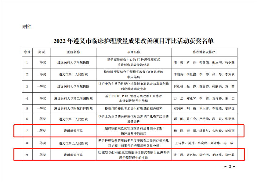 日前,遵义市卫生健康局发布了《关于2022年遵义市临床护理质量成果改善项目评比活动比赛结果的通报》,贵州航天医院两个参赛项目《超前镇痛规范化管理在骨科患者围手术期快速康复中的应用》(杨阳、李娟、潘胜红、朱迎春、刘荣丽)、《以ERAS为目标的三维质量评价模式在脑出血患者护理干预管理中的实践》(张璇、庹必灿、陈怡芳、毛晓纯、郑仲乾),荣获2022年遵义市临床护理质量改善成果项目评比二等奖!