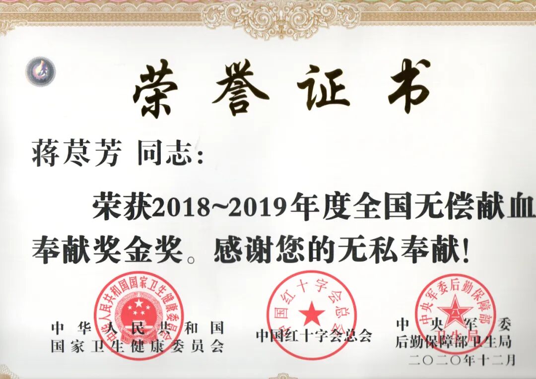 贵州航天医院检验科党支部书记、主任蒋荩芳,荣获“2018-2019年度全国无偿献血奉献奖金奖”。他自2001年开始无偿献血,累计献血28次,献血总量10600ml,其中全血25次、单采血小板3次,在每一次无偿献血活动中,他始终身体力行,用不同方式鼓励身体健康的人们定期献血,带动医院青年积极参与无偿献血,他常说,“无偿献血是爱和奉献的体现,是身体健康的体现,希望每一滴热血都能帮助到他人”。