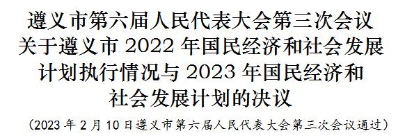 遵义市第六届人民代表大会第三次会议审查了市人民政府提出的《遵义市2022年国民经济和社会发展计划执行情况与2023年国民经济和社会发展计划草案的报告》及2023年国民经济和社会发展计划草案。会议同意市六届人民代表大会财政经济委员会的审查结果报告,决定批准《遵义市2022年国民经济和社会发展计划执行情况与2023年国民经济和社会发展计划草案的报告》,批准2023年国民经济和社会发展计划。 遵义市第六届人民代表大会第三次会议审查了市人民政府提出的《遵义市2022年预算执行情况和2023年预算草案的报告》及2023年市本级预算草案。会议同意市六届人民代表大会财政经济委员会的审查结果报告,决定批准《遵义市2022年预算执行情况和2023年预算草案的报告》,批准2023年市本级预算。 遵义市第六届人民代表大会第三次会议听取和审议了市人大常委会主任何薇受市人大常委会委托所作的工作报告。会议充分肯定市人大常委会过去一年的工作,同意报告提出的2023年主要工作任务,决定批准这个报告。 会议强调,2023年是全面贯彻落实党的二十大精神的开局之年,高质量发展是全面建设社会主义现代化国家的首要任务。市人大常委会要在中共遵义市委的坚强领导下,高举中国特色社会主义伟大旗帜,坚持以习近平新时代中国特色社会主义思想为指导,深入学习习近平法治思想和习近平总书记关于坚持和完善人民代表大会制度的重要思想,全面贯彻党的二十大精神和省、市党代会精神,坚持党的领导、人民当家作主、依法治国有机统一,认真履行宪法法律赋予的各项职责,深入践行全过程人民民主,充分发挥人民代表大会制度优势,聚力实施主战略、实现主定位,奋力推动党的二十大精神在黔北大地落地生根、开花结果,为谱写遵义现代化建设新篇章作出更大贡献! 遵义市第六届人民代表大会第三次会议听取和审议了市中级人民法院院长卢飏所作的工作报告。会议充分肯定市中级人民法院过去一年的工作,同意报告提出的2023年工作安排,决定批准这个报告。 会议强调,市中级人民法院要在中共遵义市委的坚强领导下,坚持以习近平新时代中国特色社会主义思想为指导,衷心拥护“两个确立”、忠诚践行“两个维护”,全面贯彻党的二十大精神,认真落实省、市党代会精神,紧紧围绕实施主战略、实现主定位,锚定遵义建设西部领先的现代化强市目标,忠实履行宪法法律赋予的职责,充分发挥审判职能,纵深推进司法体制改革,持续深化智慧法院建设,巩固提升审判执行质效,锻造过硬司法干部队伍,维护国家政治安全,确保社会大局稳定,促进社会公平正义,保障人民安居乐业,推进更高水平的平安遵义、法治遵义建设,为谱写遵义现代化建设新篇章提供更加有力的司法保障! 遵义市第六届人民代表大会第三次会议听取和审议了市人民检察院检察长王勇所作的工作报告。会议充分肯定市人民检察院过去一年的工作,同意报告提出的2023年工作安排,决定批准这个报告。 会议强调,市人民检察院要在中共遵义市委的坚强领导下,坚持以习近平新时代中国特色社会主义思想为指导,衷心拥护“两个确立”、忠诚践行“两个维护”,全面贯彻党的二十大精神,认真落实省、市党代会精神,紧紧围绕实施主战略、实现主定位,锚定遵义建设西部领先的现代化强市目标,忠实履行宪法法律赋予的职责,充分发挥检察职能,纵深推进司法体制改革,推进检察工作全面协调充分发展,锻造过硬司法干部队伍,维护国家政治安全,确保社会大局稳定,促进社会公平正义,保障人民安居乐业,推进更高水平的平安遵义、法治遵义建设,为谱写遵义现代化建设新篇章提供更加有力的司法保障!