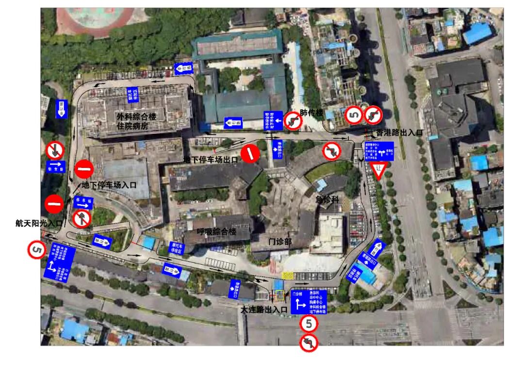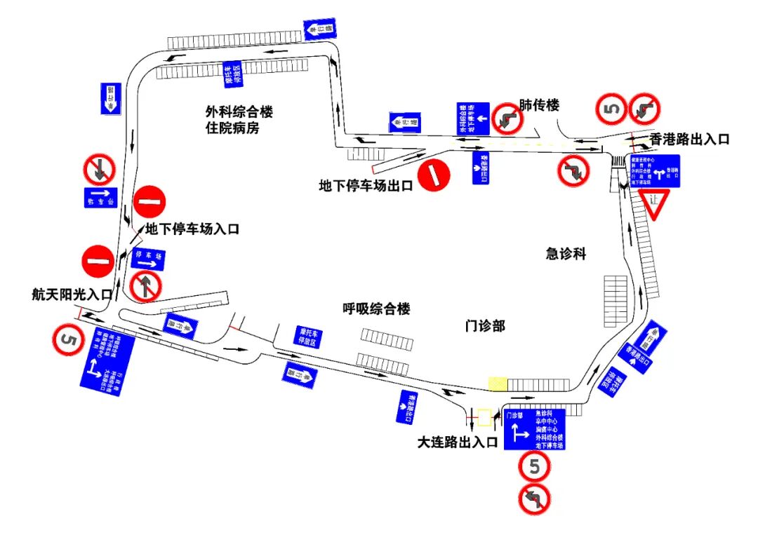 速收藏 贵州航天医院 交通指引、停车攻略 尊敬的广大市民朋友: 为方便广大群众看病就医,保障院区车辆通行顺畅,避免交通拥堵,本期为大家带来贵州航天医院院内交通指引、停车攻略,以期能最大程度给大家带来就诊便利。 院区交通指引 院区车道路线规划 院区车道路线规划为全程单行道。 从大连路正门入口处进入车辆需往香港路方向出口、大连路正门方向出口驶出; 从香港路入口处进入车辆需往大连路正门方向出口、香港路方向出口驶出; 从大连路航天阳光入口进入车辆需往大连路正门方向出口、香港路方向出口驶出。 院区车道路线规划平面图 院区车道路线规划俯瞰图 医院进出口 医院的进出口为三进两出。 进口:大连路方向入口、香港路方向入口、航天阳光方向入口。 出口:大连路方向出口、香港路方向出口。 大连路方向进出口 大连路方向进出口 大连路航天阳光方向进口 香港路方向进出口 停车指南 机动车辆 医院设有露天停车场、地下停车场,共计286个车位,就诊人员及家属可根据指引选择车位停放。 摩托车、电动自行车 摩托车、电动自行车停放点设置于医院外科综合楼1楼外侧、呼吸综合楼1楼外侧、健康广场外侧处。 摩托车、电动自行车停放点 外科综合楼1楼外侧 摩托车、电动自行车停放点 呼吸综合楼1楼外侧 摩托车、电动自行车停放点 健康广场外侧处 医院停车收费标准 医院社会车辆收费标准 (一)30分钟内免费。 (二)2小时内收费5元,超过2小时加1元/辆/小时,24小时最高为15元/辆。 (三)超过24小时重新记费。 免费车辆 (一)因工作需要,符合免费条件的车辆。 (二)透析病人车辆。 (三)住院患者车辆7天内免费停放(需由患者或家属向医院提供车牌号,仅限1辆) 其他免费车辆 (一)军用车辆、公安值勤车辆。 (二)运送急救病人来院的车辆。 (三)来院办理公务的车辆。 推荐阅读,关注我们 1.【行业翘楚】贵州航天医院呼吸与危重症医学科年度成就精彩回顾之一--荣誉篇 2.【行业翘楚】贵州航天医院呼吸与危重症医学科年度成就精彩回顾之二--能力篇 3.【行业翘楚】贵州航天医院呼吸与危重症医学科年度成就精彩回顾之三--学术篇 4.【行业翘楚】贵州航天医院呼吸与危重症医学科年度成就精彩回顾之四——责任担当篇 5.【行业翘楚】贵州航天医院呼吸与危重症医学科精彩回顾之五——优势技术篇