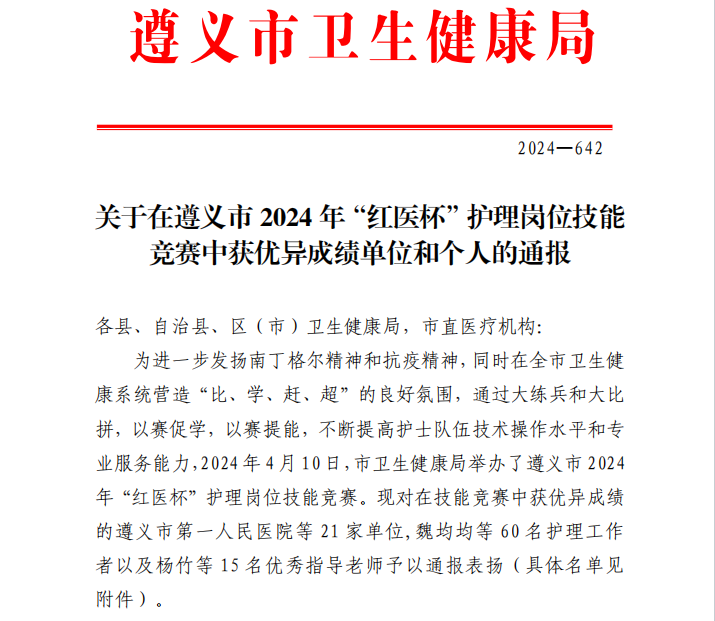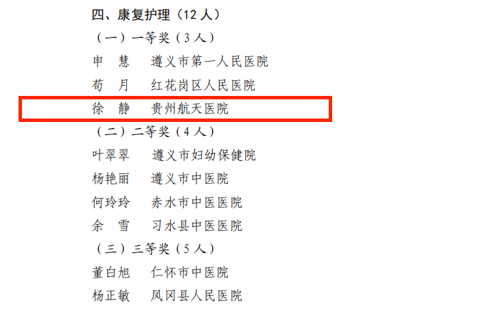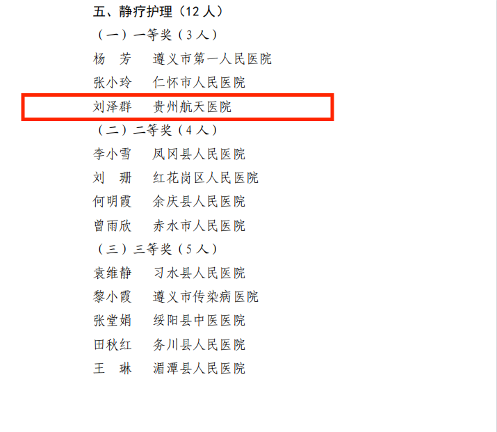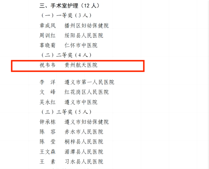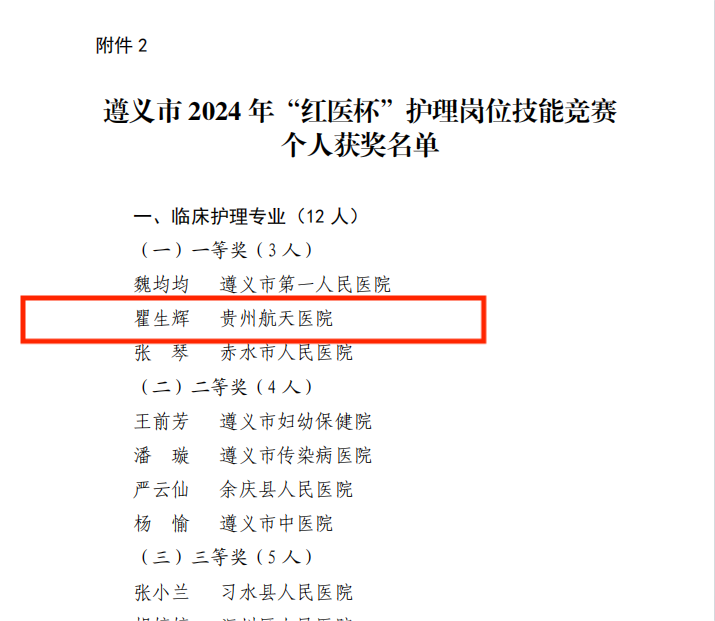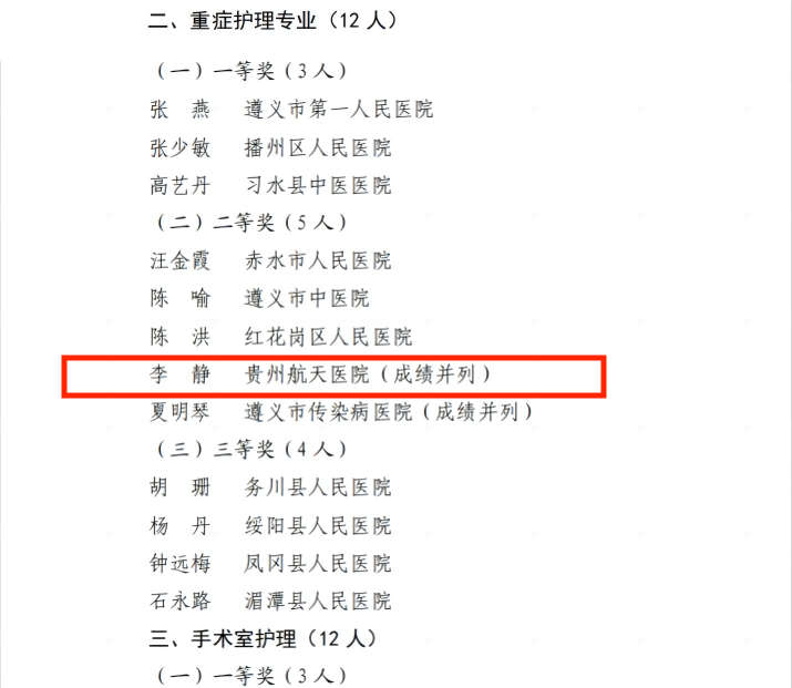 热烈祝贺 贵州航天医院荣获遵义市 2024年“红医杯”护理岗位 技能竞赛多个奖项 在“5·12”护士节来临之际,遵义市2024年“红医杯”护理岗位技能竞赛结果公布,我院参赛选手表现突出,斩获技能竞赛团体一等奖、3项个人一等奖、2项个人二等奖,3人获评优秀指导教师。 荣获技能竞赛团体一等奖 产科瞿生辉同志荣获技能竞赛临床护理专业个人一等奖 神经外科徐静同志荣获技能竞赛康复护理个人一等奖 呼吸与危重症医学科刘泽群同志荣获技能竞赛静疗护理个人一等奖 肾脏风湿科李静同志荣获技能竞赛重症护理个人二等奖 麻醉科祝韦韦同志荣获技能竞赛手术室护理个人二等奖 产科张雅楠、康复科毛晓纯、护理部曹廷芬同志获评技能竞赛优秀指导老师 贵州航天医院历来高度重视护理质量,注重提升护理人员执业技能水平,增强护理人员职业素养,在比赛中的优异表现是日复一日努力的体现。 贵州航天医院将不断加强护理队伍建设和管理,持续提升护理服务质量,为广大群众提供更加优质的医疗护理服务。 精彩推荐 3.【航医简讯】1.我院开展5.11防治肥胖及肾脏病并发症公益义诊宣传活动;2.我院开展2024年度上半年反恐防暴应急演练 贵州航天医院简介 贵州航天医院位于红城遵义市中心地段大连路615号,历经五十余年的峥嵘岁月,已发展为集医疗、急救、预防、保健、科研、教学为一体的市属三级甲等综合医院。医院始于三线建设,由原〇六一基地3417、3427医院合并而成,2019年移交遵义市人民政府管理。是遵义医科大学附属航天医院、遵义市第二城市医疗集团总院。 医院占地面积4万平方米,总建筑面积10.2万平方米,编制床位1200张,设有临床、医技、行政职能科室共60个。现有职工1174人,国务院特殊津贴专家2人,二级教授1人,三级教授1人,博士、硕士研究生导师6人,贵州省千层次人才1人,遵义市15851二层次人才2人,博士、硕士112人(含在读),高级职称以上214人。 医院现有2个国家卫健委能力建设和继续教育建设中心〔肿瘤微创介入(肺癌方向)和神经外科〕,1个省级重点学科(呼吸与危重症医学科),6个省级重点专科(呼吸与危重症医学科、神经内科、骨科、泌尿外科、急诊科、消化内科),2个市级重点学科,10个市级重点专科。是亚洲冷冻治疗学会常务理事单位、中国人体健康科技促进会首批呼吸介入技术培训基地、遵义市呼吸内科专业医疗质量控制中心、遵义市呼吸疾病临床医学中心、遵义市骨科临床医学中心、遵义市肺癌与肺小结节早期诊断精准医学重点实验室、遵义市城市检测基地。 呼吸与危重症医学科开展的肺部血管介入治疗,经纤支镜下冷冻、氩氦刀、高频电刀治疗良恶性肿瘤,使我院肺部疾病诊疗技术迈入国内先进水平。泌尿外科开展的腹腔镜下膀胱癌和前列腺癌根治术走在贵州省前列。消化内科在脂肪肝、肝纤维化、肝硬化无创诊断技术和胃肠动力疾病全程规范管理达到国内先进水平。医学检验科结核病诊断技术水平已居于国内前列。心血管内科特色开展冠脉复杂病变、结构性心脏病等优势介入手术,神经内科、骨科、急诊科、心胸外科等重点专科诊疗水平已居于全市前列。近年来,医院科研教学能力显著提升,三年内共承担省科技厅、省卫健委等科研项目73项,发表核心期刊11篇,SCI 6篇,省级259篇。 医院以遵义市第二城市医疗集团为依托,按照“一院多区”模式,实现双向转诊汇川区域全覆盖,着力打造“心电一张网”、继发性高血压筛查等项目,以慢性病、多发病为切入点,推动优质医疗资源下沉。聚焦公立医院改革与高质量发展示范项目,以呼吸与危重症医学科等优势学科为引领,积极推进医联体、专科联盟建设,带动区域内基层技术服务能力提升。 End