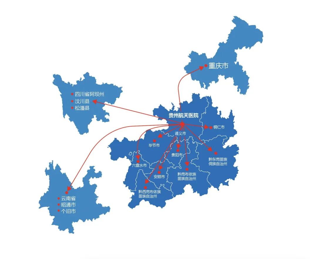 贵州航天医院自2016年与赤水市人民医院结成对口帮扶关系以来,先后选派37名专家驻点帮扶赤水市人民医院儿科、泌尿外科、急诊科、麻醉科、神经外科、呼吸内科、消化内科、骨科、检验科、影像科等科室,通过进行教学查房、会诊、举办学术讲座、开展义诊活动、免费接收医护人员进修学习等形式传授临床经验、专业技术,并不定期联合开展“万医下基层”、“服务百姓健康行动”等义诊活动,直接、间接服务群众数万人次。