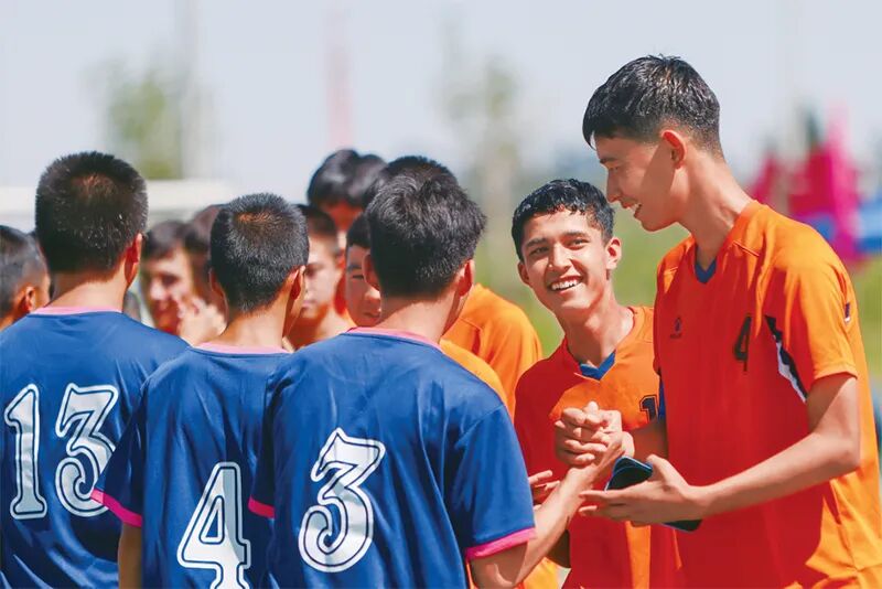 2023年8月30日,2023年黔新“石榴籽”杯青少年足球友谊赛在新疆喀什落下帷幕。友谊赛为期两天,有来自贵州省黔西南布依族苗族自治州及新疆维吾尔自治区喀什地区、克孜勒苏柯尔克孜自治州的10支球队200余名青少年参赛。活动期间,各族青少年球员在球场上切磋球技、在交流中建立友谊。图为8月29日,黔西南U15男队(左)和喀什U15男队(右)参赛选手比赛结束后互相击掌致意。 新华社记者 郝昭/摄