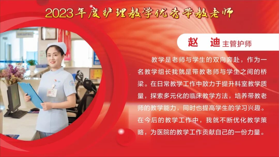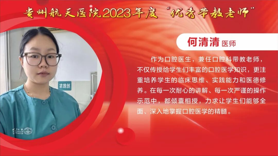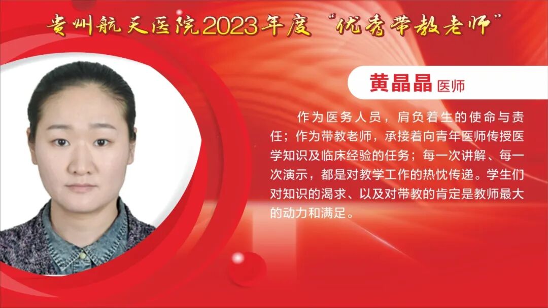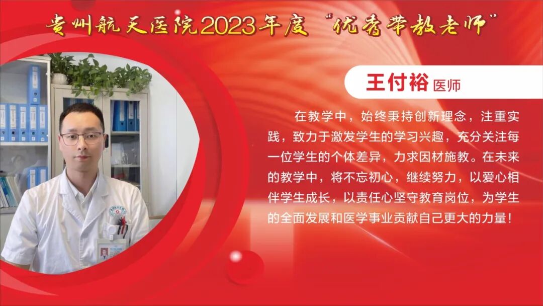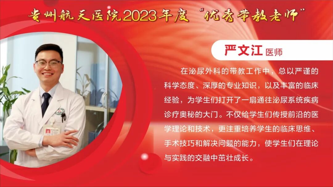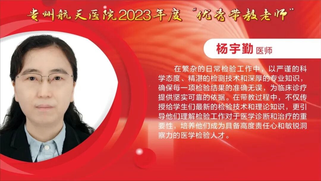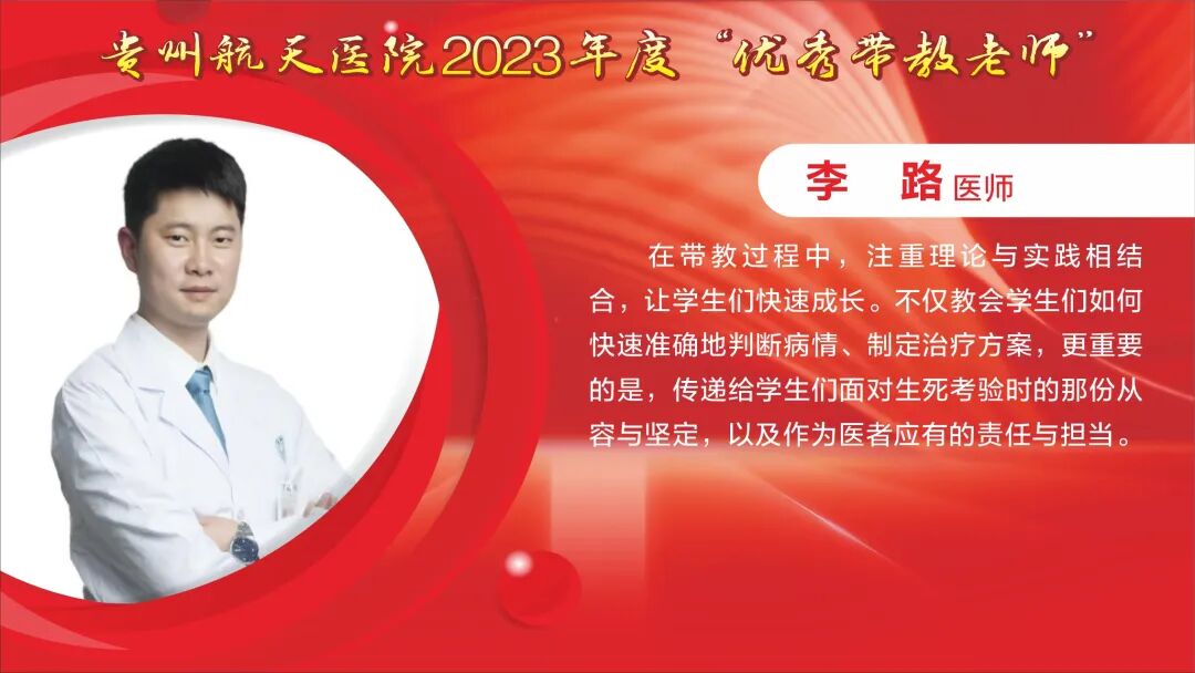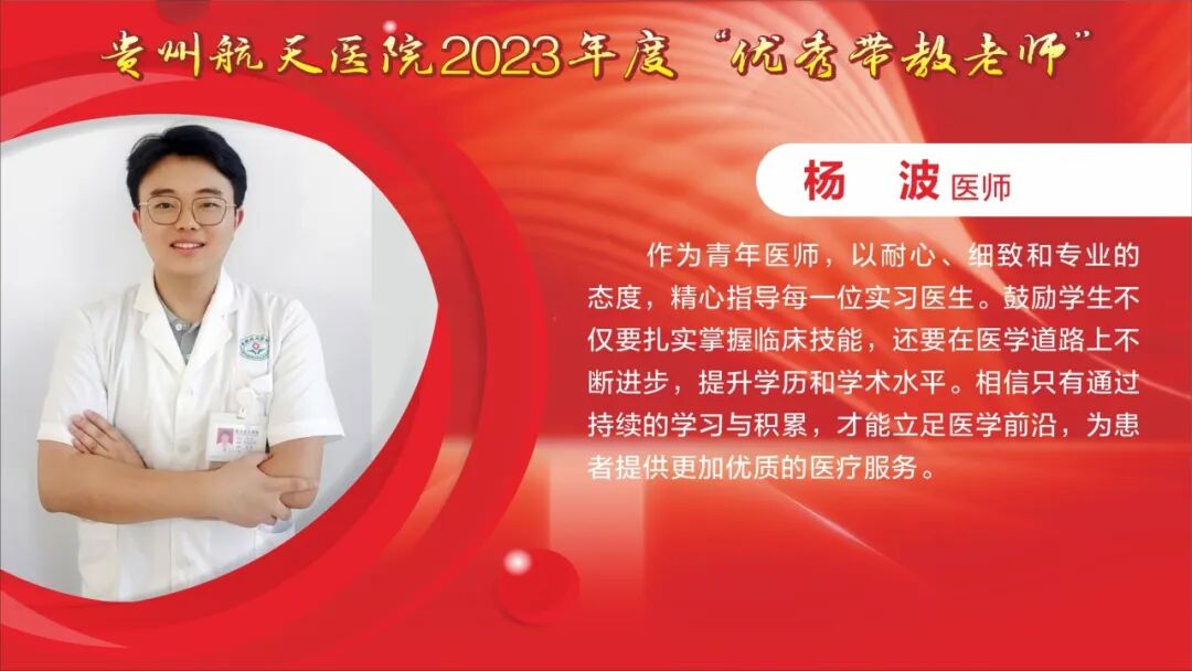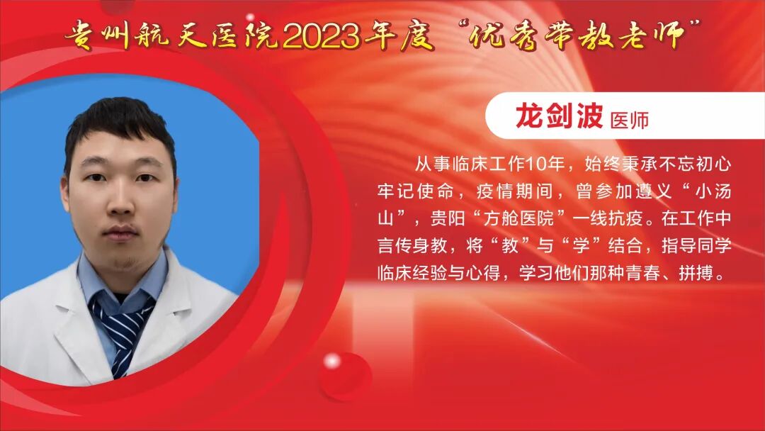 教师节快乐! 祝所有的老师: 最敬爱的老师: 一朝沐杏雨,一生念师恩,衷心感谢贵州航天医院全体教师的默默耕耘和辛勤付出。桃李不言,下自成蹊,今天是我国第40个教师节,祝福敬爱的老师们教师节快乐! TEACHERS' DAY 教师节快乐 HAPPY TEACHERS' DAY 杏林春暖,橘井生香。 默默耕耘,桃李天下。 贵州航天医院的老师们 在医学传承的路上, 甘为人梯, 把毕生所学倾囊相授, 让一批又一批 年轻医务工作者茁壮成长。 致尊敬的老师 他们踏实履行“救死扶伤”和“教书育人”的双重天职,用大爱与神圣诠释着医者仁心和师者良心。 他们传授给学生的不仅是最前沿的医学知识和丰富的临床经验,更是对生命的敬畏与责任。 值此道一声: 老师,您辛苦了! 有所教授,皆为师者。 感恩人生路上每一位师者! 祝这些医学传承路上的老师们, 教师节快乐! 贵州航天医院研究生导师风采 姜黔峰 贵州航天医院心血管内科学科带头人,医学博士,博士研究生导师,二级教授,享受国务院政府特殊津贴专家,心血管内科专家,遵义医科大学内科学骨干。 姜黔峰1995年开始承担教学工作,先后在遵义医科大学、遵医附院、遵义市第一人民医院、贵州航天医院担任教师。他高度重视医院人才梯队建设,注重青年医务人员临床、科研、教学能力综合提升, 在医院教学工作中发挥了引领作用。完成多项省、市级科研课题,主持国家自然科学基金1项。已在国内外期刊发表学术论文100余篇。 廖江荣 贵州航天医院呼吸与危重症医学科学科带头人,国务院政府特殊津贴专家,硕士研究生导师,二级教授。 廖江荣高度重视临床教学工作,特别注重对基层呼吸医师的培养,主导了省内外60余家医院建立贵州航天医院呼吸与呼吸危重症专科联盟,为基层医院提供无私的技术教学,推动了呼吸疾病介入诊疗技术在贵州省基层医院的发展。主持省部级科研项目4项,市级科研6项,作为第一或通讯作者在权威期刊上发表论文20余篇,参编专著4部,参与编写国家专家共识及指南4项。 马庆庆 贵州航天医院科教处、检验科、中心实验室主任,副主任技师,硕士研究生导师,分子生物学在读博士,日本RG基因中心访问学者。遵义市分子诊断及临床应用人才团队负责人、遵义市肺癌与肺结节精准医学重点实验室负责人。主持省部级科研项目6项,作为第一或通讯作者在权威期刊上发表论文30余篇,主编专著1部。从事临床检验诊断学11年,主要研究方向分子诊断、精准医学技术及临床应用。 贵州航天医院 2023年度优秀教师风采 一朝沐杏雨·一生念师恩 祝所有的老师节日快乐 - END - 贵州航天医院简介 贵州航天医院位于红城遵义市中心地段大连路615号,历经五十余年的峥嵘岁月,已发展为集医疗、急救、预防、保健、科研、教学为一体的市属三级甲等综合医院。医院始于三线建设,由原〇六一基地3417、3427医院合并而成,2019年移交遵义市人民政府管理。是遵义医科大学附属航天医院、遵义市第二城市医疗集团总院。 医院占地面积4万平方米,总建筑面积10.2万平方米,编制床位1200张,设有临床、医技、行政职能科室共60个。现有职工1174人,国务院特殊津贴专家2人,二级教授1人,三级教授1人,博士、硕士研究生导师6人,贵州省千层次人才1人,遵义市15851二层次人才2人,博士、硕士112人(含在读),高级职称以上214人。 医院现有2个国家卫健委能力建设和继续教育建设中心〔肿瘤微创介入(肺癌方向)和神经外科〕,1个省级重点学科(呼吸与危重症医学科),6个省级重点专科(呼吸与危重症医学科、神经内科、骨科、泌尿外科、急诊科、消化内科),2个市级重点学科,10个市级重点专科。是亚洲冷冻治疗学会常务理事单位、中国人体健康科技促进会首批呼吸介入技术培训基地、遵义市呼吸内科专业医疗质量控制中心、遵义市呼吸疾病临床医学中心、遵义市骨科临床医学中心、遵义市肺癌与肺小结节早期诊断精准医学重点实验室、遵义市城市检测基地。 呼吸与危重症医学科开展的肺部血管介入治疗,经纤支镜下冷冻、氩氦刀、高频电刀治疗良恶性肿瘤,使我院肺部疾病诊疗技术迈入国内先进水平。泌尿外科开展的腹腔镜下膀胱癌和前列腺癌根治术走在贵州省前列。消化内科在脂肪肝、肝纤维化、肝硬化无创诊断技术和胃肠动力疾病全程规范管理达到国内先进水平。医学检验科结核病诊断技术水平已居于国内前列。心血管内科特色开展冠脉复杂病变、结构性心脏病等优势介入手术,神经内科、骨科、急诊科、心胸外科等重点专科诊疗水平已居于全市前列。近年来,医院科研教学能力显著提升,三年内共承担省科技厅、省卫健委等科研项目73项,发表核心期刊11篇,SCI 6篇,省级259篇。 医院以遵义市第二城市医疗集团为依托,按照“一院多区”模式,实现双向转诊汇川区域全覆盖,着力打造“心电一张网”、继发性高血压筛查等项目,以慢性病、多发病为切入点,推动优质医疗资源下沉。聚焦公立医院改革与高质量发展示范项目,以呼吸与危重症医学科等优势学科为引领,积极推进医联体、专科联盟建设,带动区域内基层技术服务能力提升。