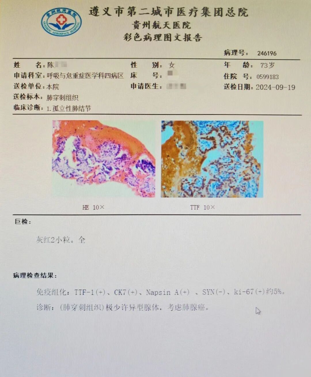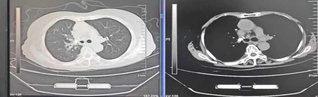 患者陈阿姨3年来长期遭受咳嗽、咳痰伴喘累、气促等的困扰,最近3月又新增了口干的症状,在了解到我院呼吸疾病诊治的相关信息后,前往我院呼吸与危重症医学科就诊,为明确患者病因,呼吸与危重症医学科进行了CT、肺穿刺病理诊断等相关检查后,诊断为:右上肺腺癌。