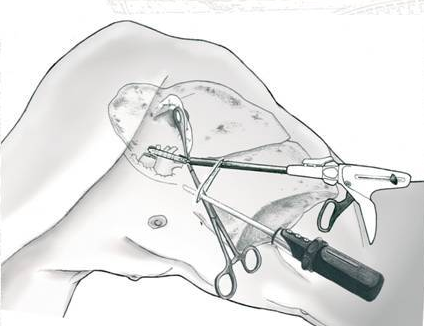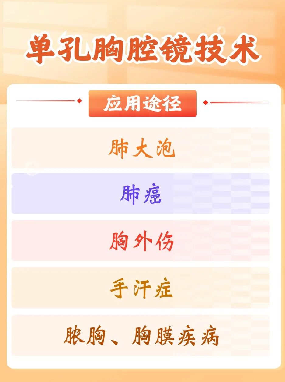 单孔胸腔镜技术是微创手术的一种,通过长约3-5厘米的单一手术切口置入胸腔镜(摄像头),观察显示屏幕上胸腔病变部位情况,然后伸入手术器械、相互配合,进行手术切除病灶,应用于肺大泡、肺癌、胸外伤、手汗症等多种胸部疾病治疗。