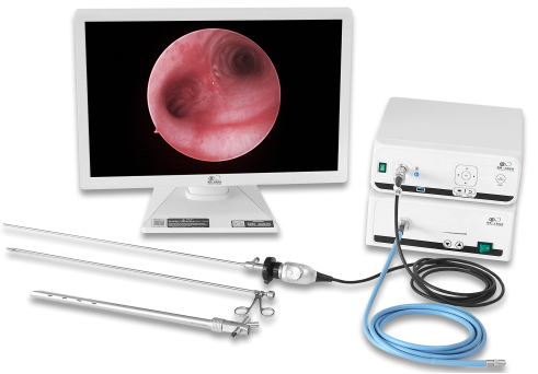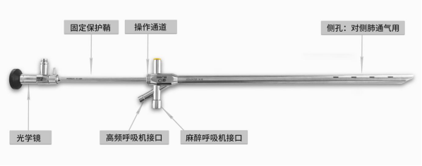 硬镜的操作端有多个接口,包括呼吸机接口、光源接口、吸引管和激光纤维接口。开口的近端可被封闭或开放,以利于观察目镜/电子支气管镜和其他器械通过。观察目镜长55cm,外径4.5mm,接光源后可通过硬镜管腔作窥视检查。