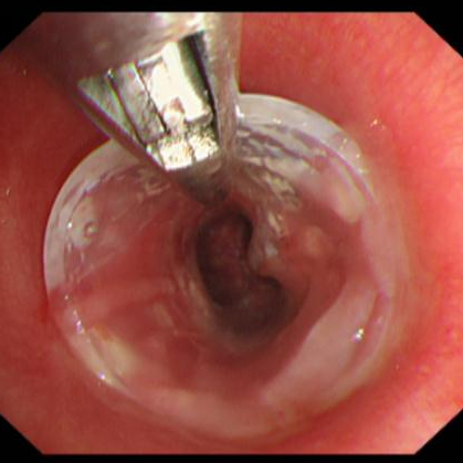 经过术前的充分准备,患者在全麻下,用可弯曲支气管镜引导插入法插入硬镜,通过高频电刀放射状切开狭窄环,再予气道球囊扩张器扩张气道置入硅酮支架,并置入喉罩复苏,最后成功为患者实施硬质支气管镜技术。术后,患者气道通畅,无呼吸困难、气促等症状出现,对比术前生活质量得到明显改善。