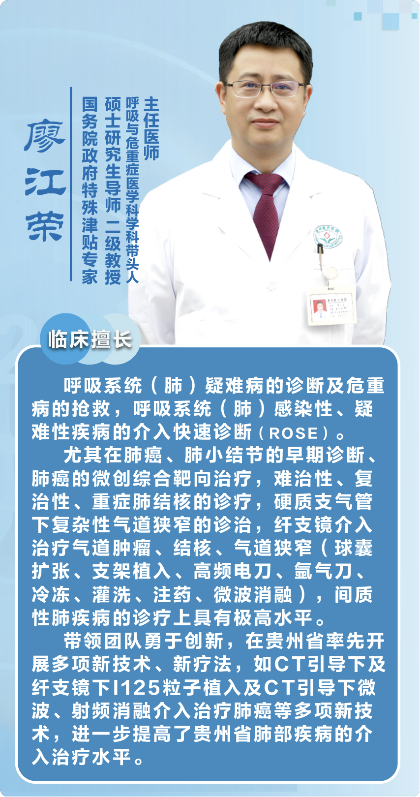 专业擅长:从事临床工作约16年,对呼吸危重病的救治有独到的见解,尤其擅长呼吸系统疾病的介入诊疗,对呼吸内镜下的诊治及经皮肺穿刺诊疗技术具有丰富的临床经验。