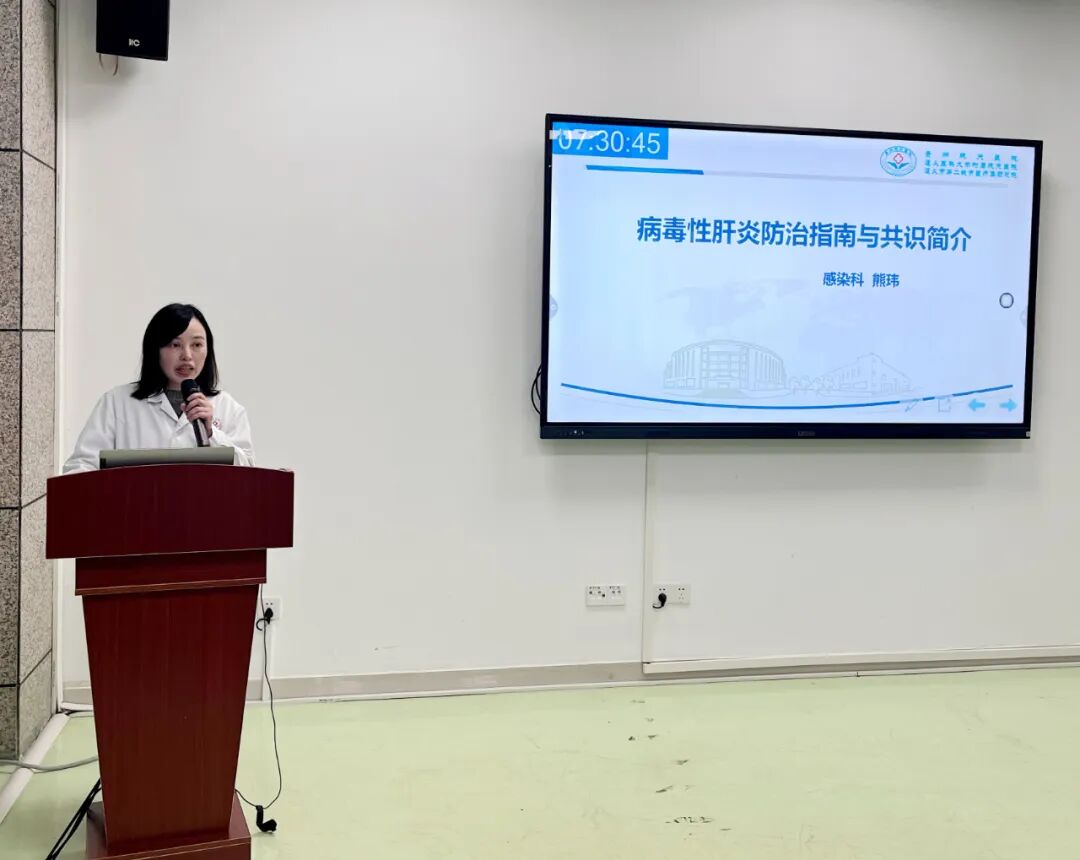12月25日,贵州航天医院第44次晨读会由我院感染科主任、副主任医师熊玮讲解“病毒性肝炎防治指南与共识简介”,她从病毒性肝炎的筛查、诊断、治疗等方面,详细讲解了丙型肝炎防治指南、 慢性乙型肝炎防治指南、戊型肝炎防治共识。 科室简介 贵州航天医院感染科开设有感染科门诊、发热门诊、肠道门诊、疾控门诊及感染性疾病病区,开放床位24张。目前共有医护人员14名,副高级以上专家4人。科室诊疗范围包括:病毒性肝炎、肝硬化、HIV感染、伤寒、流行性出血热、水痘、腮腺炎、流行性感冒、不明原因发热、新发传染病等各种感染性疾病的诊断、鉴别诊断和治疗。对抗生素类药物的合理应用有着丰富的临床经验。对长期不明原因发热、顽固性肝硬化腹水、重症肝炎、流行性出血热、感染性休克等危重病例的治疗有着独到经验。 专家简介 熊玮 感染科主任 副主任医师 专业擅长:从事感染性疾病工作20余年,对慢性乙型肝炎、丙型肝炎、肝硬化、抗生素的合理使用、肝病及感染性疾病的诊治具有丰富的临床经验。 遵义市医学会肝病学分会常务委员,遵义市医学会感染病学分会委员,贵州省中西医结合肝病学分会委员,贵州省肝病学分会委员;获得贵州省高层次人才服务绿卡C类;主持、参与并完成省部级科研项目2项。 张艳玲 感染科 副主任医师 专业擅长:从事感染性疾病临床医疗工作30余年,对感染性疾病的疑难杂症的处理及感染性疾病的常规诊疗具有丰富的临床经验,目前主攻慢性乙型活动性肝炎及乙肝肝硬化的抗病毒抗纤维化治疗、慢性肝病的营养支持治疗。 遵义市医疗事故鉴定委员会专家库成员,1986年毕业于遵义医科大学临床医疗系,1990年曾前往上海市传染病总院进修学习一年,发表论文近10篇。 余乐兰 感染科 副主任医师 专业擅长:对感染科常见病、多发病的诊治,特别是慢性乙型病毒性肝炎、丙型病毒性肝炎、肝硬化、自身免疫性肝病、药物性肝病、洒精性肝病、发热待查等疾病以及乙肝母婴阻断等的诊疗具有丰富的临床经验。 遵义市医学会肝病学分会委员会委员,遵义市医学会感染病学分会委员会委员,发表论文10余篇。