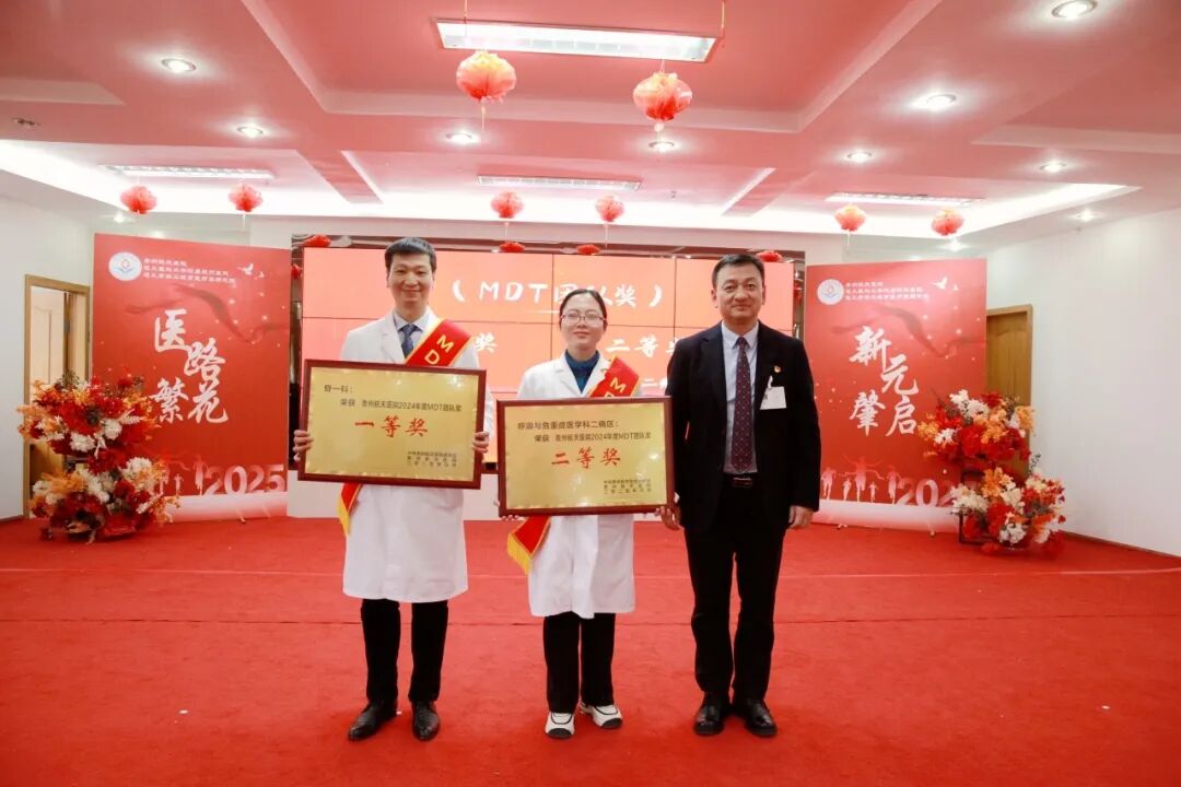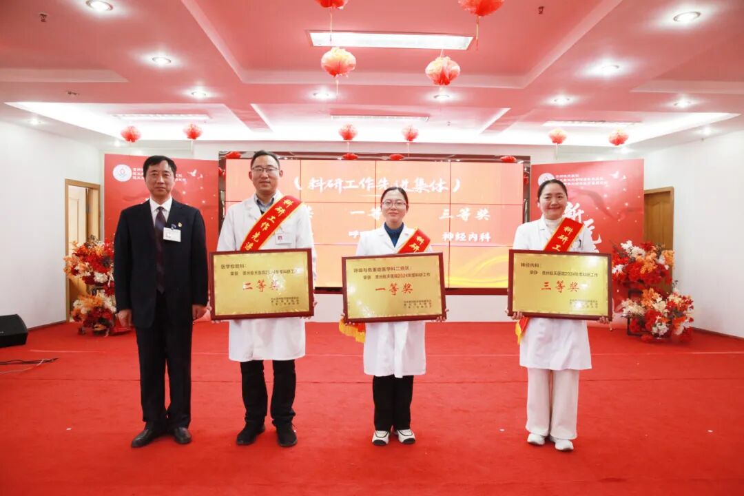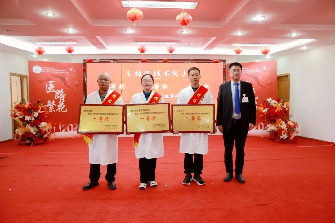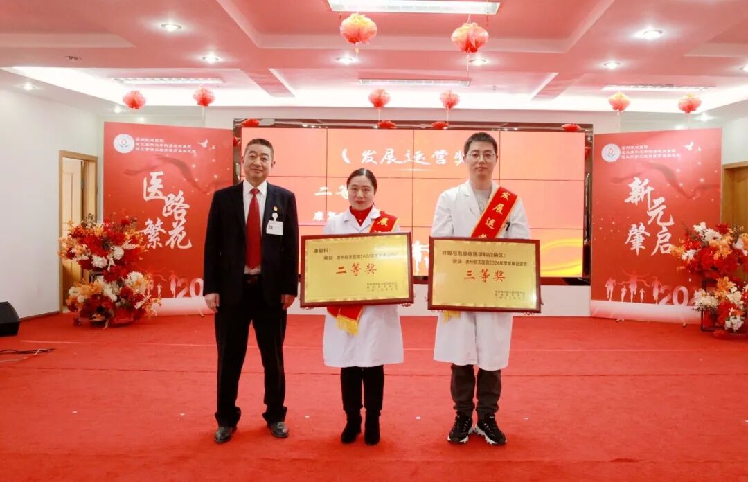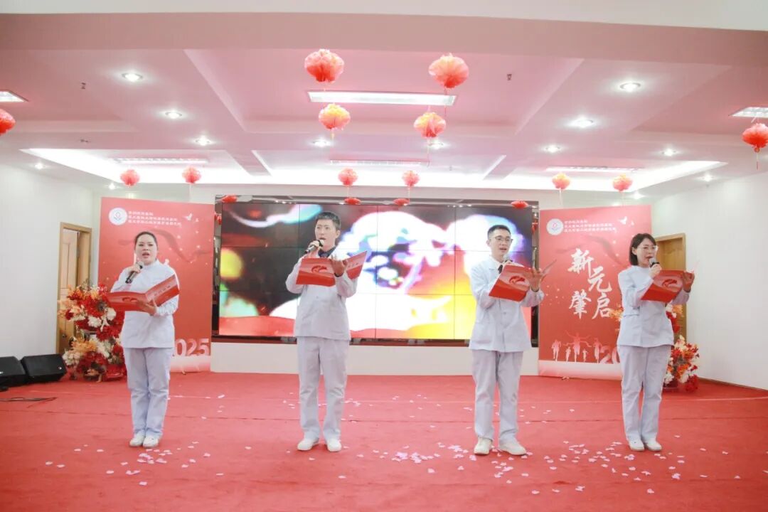 1月24日,在一片欢乐温馨的节日氛围中,贵州航天医院领导班子成员、干部职工、受表扬人员、特邀嘉宾等欢聚一堂,迎来了“‘医’路繁花 新元肇启”2024年总结表扬大会暨2025年新春文艺汇演,携手欢庆过去一年奋力拼搏取得的丰硕成果,共同开启新一年的美好征程! 总结表扬大会 党委书记杨军代表医院领导班子成员向受表扬的集体和个人表示热烈祝贺,并激励大家在今后的工作中要继续立足岗位,树牢“以患者为中心”的服务理念,再接再厉,为保障人民群众的健康做出更大贡献。 会上,党委副书记、院长姜黔峰宣读《贵州航天医院2024年度先进集体及先进个人》表扬文件,对过去一年中表现突出的集体与个人进行表扬。 表扬现场 优秀管理人员 发展运营奖 优秀科室 十佳员工 医疗质量与安全奖 优秀质控员 精品技术奖 MDT团队奖 科研先进集体 科研先进个人 教学先进集体 教学先进个人 医保价格管理先进集体 医保价格管理先进个人 医德医风先进集体 医德医风先进个人 新春文艺汇演 汇演伊始,杨军在致辞中代表医院领导班子向履职尽责、辛勤奉献的全体干部职工致以诚挚的问候,并鼓励大家站在新起点,展望新高度,为守护群众健康再谱新篇。 会上,德江县民族中医院党委书记熊鹤为我院送上新春的祝福,他表示,在新的一年中,两院将赓续情谊,深化合作,充分发挥中医力量,为广大群众健康保驾护航。 文艺汇演 精彩瞬间 各分工会、德江县民族中医院 精心编排的 15个节目轮番上演 灯光璀璨,气氛热烈 幽默的小品、动人的歌声 优美的舞蹈、深情的演奏 …… 掀起了阵阵高潮 充分展现了航医人多才多艺、 开拓创新、爱岗敬业、团结奋进 的精神风貌 内科二分工会 古典舞:《湘江雨畔》 康复医学科 说唱表演:《康复医学,你可知晓?》 皮肤科 古筝独奏:《大话西游》 门急机关后勤分工会 舞蹈:《美丽的神话》 外科二分工会 诗朗诵:《赞白衣天使》 产 科 情景剧:《产房那些事》 外科一分工会 歌 曲:《太 阳》 医技分工会 舞蹈串烧:《医路欢舞 福满新春》 医务部 护理部 合 唱:《如 愿》 血管甲乳外科 乐器二重奏:《山楂树》 德江县民族中医院 情景剧:《中医之光 闪耀舞台》 急诊科 手 语:《明天会更好》 中医科 小 品:《新时代的中医人》 手术麻醉科 双人舞:《乌兰巴托的夜》 门急机关后勤分工会 歌曲串烧:《点亮2025逐梦前行》 此次新春文艺汇演,不仅为医院职工提供了一个展现自我的舞台,丰富了职工的文化生活,更是航医文化的凝聚和绽放。 2025年,贵州航天医院将秉承“以患者为中心”的服务理念,锚定“强技术、优服务、美环境”的目标,加强医学人文关怀,不忘初心,砥砺前行,以团结奋进的姿态、锐意进取的精神,继续为守护群众的健康全力以赴。