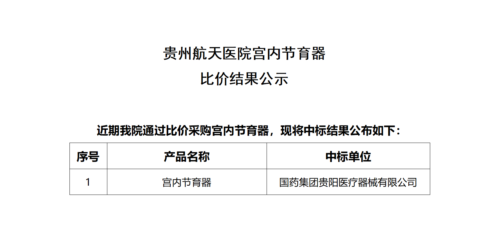 贵州航天医院宫内节育器比价结果公示