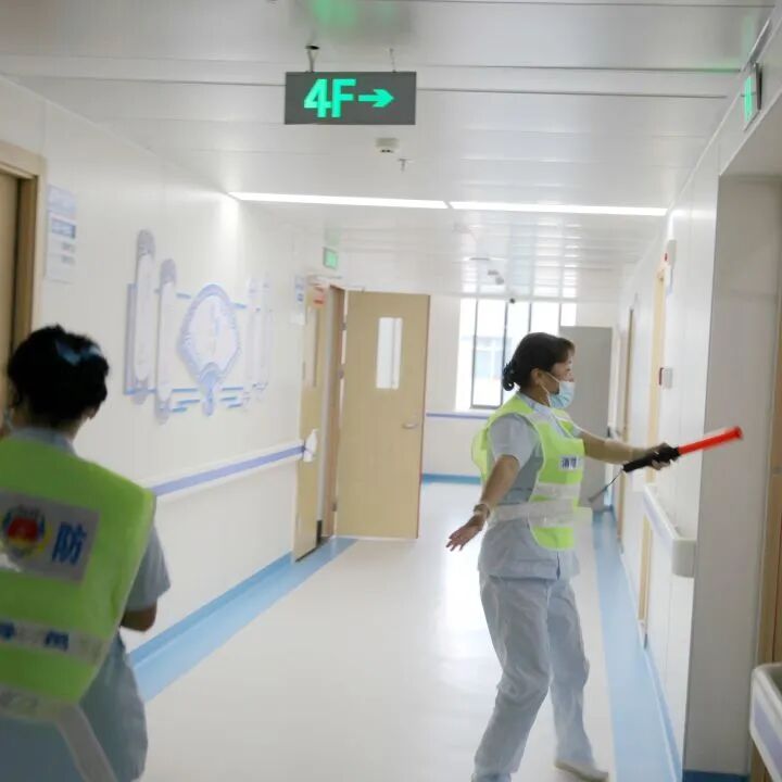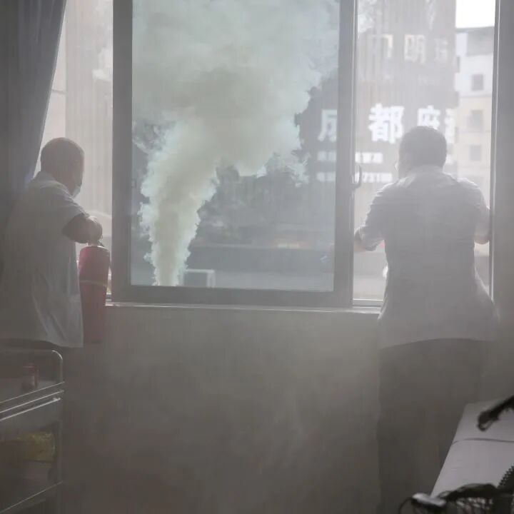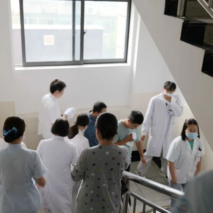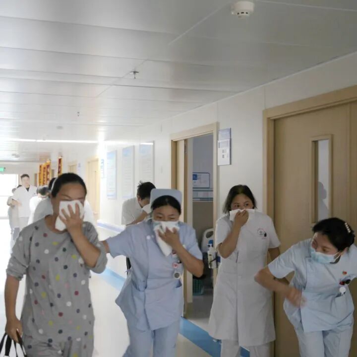 理论培训后,应急疏散演练在呼吸综合楼四楼呼吸一病区展开,模拟演练护士值班室电器故障引发火灾。医务人员迅速启动应急预案,分工进行报警、初起火灾扑救和人员疏散。因“火势”蔓延,现场立即请求119支援。消防救援力量迅速到场,高效开展灭火救援,成功“扑灭”大火。整个演练过程紧张有序。