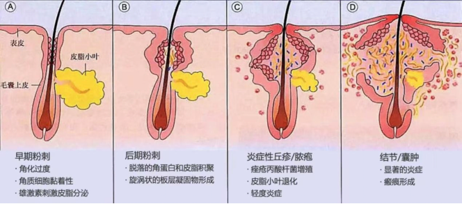 Tip 战“痘”是很多人的青春必修课,但你真的了解痘痘吗?今天一篇讲清痤疮的防治全攻略,帮你少踩坑、少留疤~ 痘痘学名“痤疮”,是毛囊皮脂腺的慢性炎症。全球约9.4%的人受困扰,青少年中40%-80%都会长!它不仅影响颜值,若反复挤压或处理不当,还可能留下深浅不一的萎缩性瘢痕(脸颊常见)或增生性瘢痕(下颌多见),甚至影响心理状态。 痤疮的发病原因主要有以下几点 (一)皮脂分泌过多:雄激素刺激皮脂腺“疯狂”分泌油脂。 (二)毛囊角化异常:毛囊口角质异常堆积,形成微粉刺。 (三)微生物定植:痤疮丙酸杆菌等微生物繁殖,分解油脂引发炎症。 (四)炎症反应:身体免疫反应释放炎症因子,加重红肿。 痤疮临床表现与分级 寻常痤疮主要依据皮损性质分为 4级、3度(强调皮损性质,不考虑皮损数量),即: Ⅰ级(轻度):仅有粉刺; Ⅱ级(中度):有炎性丘疹; Ⅲ级(中度):出现脓疱; Ⅳ级(重度):有囊肿、结节。 治痘分阶段,不同情况用不同招 针对痤疮治疗,根据患者病情严重程度、年龄和性别等制定个性化治疗方案,具体包括: ·外用药:维A酸乳膏调节角质,过氧化苯甲酰、克林霉素消炎杀菌; ·口服药:中重度选多西环素等抗生素(疗程6-12周),重度推荐异维A酸(唯一能改变痘痘“自然病程”的药),女性激素性痤疮可用避孕药或螺内酯; ·物理治疗:红蓝光消炎修复,光动力适合囊肿型痘痘,点阵激光改善痘疤。 痤疮日常护理 护理四步走: ▫️清洁:选温和的氨基酸洁面,每天1-2次,别过度。 ▫️保湿:用含神经酰胺、透明质酸的无油护肤品。 ▫️防晒:优先物理防晒(戴帽子、打伞)更温和。 ▫️修复:痘痘消了但泛红,用含积雪草、烟酰胺的产品。 吃对少长痘:避开高糖、高GI食物(奶茶蛋糕)、脱脂奶、饱和脂肪酸;多吃酸奶、蔬果和粗粮。 生活习惯:23点前睡觉(熬夜刺激皮脂分泌),少压力(压力大皮质醇升高也促油),别抽烟(尼古丁加重毛囊堵塞)。 特殊人群:敏感肌痤疮治疗 敏感肌痤疮避免面部过度清洁,先修复皮肤屏障再治痘。用维A酸要选低浓度(0.03%),慢慢建立耐受,别急功近利~ 痘后修复:不同“疤”有不同解法 ▫️红痘印:脉冲染料激光、强脉冲光 ▫️褐色痘印:氢醌、熊果苷、维生素C ▫️痘坑:皮肤磨削术或手术切除 ▫️萎缩性瘢痕:点阵CO₂激光 ▫️增生性瘢痕:激素注射或手术 就医指征 ✔ 自行护理3个月无效 ✔ 伴有疼痛性结节/囊肿 ✔ 遗留明显瘢痕 ✔ 女性伴月经紊乱或多毛 ✔ 出现抑郁等心理问题 以上内容参考文献: [1] 鞠强.中国痤疮治疗指南(2019修订版)[J].临床皮肤科杂志,2019,48(09):583-588. [2] 何黎,郝飞.抗粉刺类护肤品在痤疮中的应用指南[J].中国皮肤性病学杂志,2019,33(10):1107-1109. 温馨提示:痤疮是一种慢性病,需坚持3-6个月规范治疗,早期干预可预防永久性瘢痕形成。 就诊指南 ◾就诊地点:门诊4楼,皮肤科门诊。 ◾服务时间: 周一至周五 08:00-12:00 13:00-17:00(午间急诊接诊) 周末 08:00-12:00 13:00-16:30 (午间急诊接诊) ◾公众号预约:「贵州航天医院」→线上服务→预约挂号→皮肤科门诊 ◾现场挂号:贵州航天医院人工窗口/自助挂号机→皮肤科门诊 ◾皮肤科咨询电话:28690450 (08:00-17:00) 注:图片来源于网络,如有侵权,请联系删除。 贵州航天医院皮肤科简介 贵州航天医院皮肤科现有7名医务人员,在读博士研究生1名、硕士研究生4名,涵盖皮肤病理、皮肤外科、中医皮肤等专业领域。是中国医学科学院皮肤病专科联盟单位、北京大学银屑病诊疗规范诊疗中心参与单位。 诊疗范围 皮肤科常见多发病诊治,疑难皮肤病的病理诊断,白癜风手术治疗,ALA光动力联合手术治疗皮肤恶性肿瘤,痤疮(粉刺,脓疱,色沉,瘢痕)的全病程痤疮管理,瘢痕的手术治疗,纹身的综合治疗,腋臭手术治疗,难治性疣的综合治疗,生物制剂治疗银屑病及特应性皮炎,重度甲沟炎的手术治疗,“胎记”的综合治疗,婴儿血管瘤的综合治疗。 专家简介——陈林 中共党员、皮肤科主任 专业擅长:从事皮肤科临床工作多年,擅长皮肤恶性肿瘤、先天性色素痣、白癜风、腋臭、纹身、甲及甲周疾病、溃疡修复和各种疤痕美容修复的治疗。 硕士研究生,遵义医学会皮肤性病学分会委员,发表专业论文多篇,主持市级研究课题1项。 皮肤科门诊区 ▪患者可乘坐门诊部电梯直达4楼—皮肤科门诊。 门诊部4楼 皮肤科门诊 ▪新诊区设有清晰指引标识,工作人员将全程协助引导,如有疑问可咨询导诊台。 ▪设备再升级:新增光动力治疗仪、二氧化碳点阵激光等设备。 END