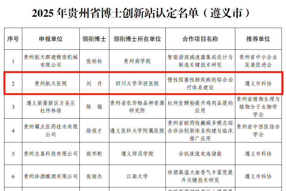 近日,贵州省科学技术协会、贵州省知识产权局、贵州省工商业联合会、贵州省民营经济和区域经济发展中心联合发布了《关于2025年贵州省博士创新站建设申报拟认定结果的公示》名单。经严格评审,贵州航天医院联合四川大学华西医院申报设立的“贵州省博士创新站”正式获批认定。这不仅标志着我院在高层次科研平台建设上取得了历史性突破,也是对我院近年来着力推动“医、教、研”深度融合发展战略所取得成果的权威认可与肯定! 贵州省博士创新站是以四川大学华西医院刘丹博士团队为领衔,由贵州航天医院申报,以创新需求为导向、长效合作为机制、产学研合作为纽带,促进建站博士与参与单位共同成长的科技创新合作载体。 领衔博士简介 刘丹 四川大学华西医院呼吸与危重症医学科主任、教授、博导 现任第十四批四川省卫健委学术带头人,第十五批四川省学术和技术带头人,美国梅奥医学中心访问学者,中华医学会呼吸病学分会第十一届青年委员,中华医学会呼吸病学分会肺癌学组成员。 开展了全球第一例经支气管新型靶去神经慢阻肺治疗,全国第一例国产支气管镜机器人活检术,西部地区第一例电磁导航支气管镜术,推进了电磁导航技术在肺癌的早期诊断中的应用,为肺癌的早期诊断及技术的发挥了推广作用。 本次成功获批博士创新站,核心聚焦于“慢性阻塞性肺疾病(COPD)的综合治疗体系建设”这一重大公共卫生需求,依托“四川大学华西医院合作中心—遵义市呼吸系统疾病临床诊疗中心(贵州航天医院)”合作载体,围绕COPD的早期筛查与规范化诊断、个体化精准治疗、危重症综合救治、康复管理以及疾病预防控制等环节,展开协同攻关与深度融合研究,致力于构建一套符合区域需求、具备引领性的、科学、高效、全程的COPD综合防治体系,最终提升区域呼吸系统疾病的整体诊疗水平和科研创新能力这一核心目标。 我院将以此次获批为契机,严格按照博士创新站的建设标准与要求,持续深化与华西医院的务实合作,高效整合内外部优质资源,加快推进项目实施,确保产出高质量的科技创新成果、培养高水平的人才梯队、构建高效的成果转化机制,切实承担起贵州省科技创新与医疗卫生事业高质量发展的重要使命!为提升区域呼吸疾病防治能力、建设健康贵州贡献航医力量! 贵州航天医院 呼吸与危重症医学科专家简介 廖江荣 国务院政府特殊津贴专家 遵义市呼吸疾病临床医学中心 学科带头人 二级教授 硕士研究生导师 主任医师 学术任职: 亚洲冷冻治疗学会副主席 中国医药教育协会介入微创专业委员会呼吸分会副主任委员 中国防痨协会超声专业委员会副主任委员 中国抗癌协会肿瘤微创治疗专业委员会常务委员 中国防痨协会多学科诊疗专业委员会常务委员 中国医疗保健国际交流促进会结核病学分会常务委员 第一届中国人体健康科技促进会呼吸介入专业委员会常务委员 中国抗癌协会第一届肿瘤组织间植入治疗专业委员会常务委员 西部呼吸介入联盟副理事长 贵州省医学会呼吸病学分会第六届委员会副主任委员 贵州省中西医结合呼吸专业委员会副主任委员 贵州省医学会结核病分会常务委员 遵义市呼吸内科专业医疗质控中心主任委员 遵义市中西医结合学会理事长 专业擅长: 呼吸系统(肺)疑难病的诊断及危重病的抢救,呼吸系统(肺)感染性、疑难性疾病介入快速诊断(ROSE),尤其在肺癌、肺小结节早期诊断,肺癌微创综合靶向治疗,难治性、复治性、重症肺结核诊疗,硬质支气管下复杂性气道狭窄诊治,纤支镜介入治疗气道肿瘤、结核、气道狭窄(球囊扩张、支架植入、高频电刀、氩气刀、冷冻、灌洗、注药、微波消融),间质性肺疾病的诊疗上具有极高水平;带领团队勇于创新,在贵州省率先开展多项新技术、新疗法,如CT引导下及纤支镜下I125粒子植入及CT引导下微波、冷冻消融介入治疗肺癌等多项新技术,带动了贵州省肺部疾病的介入治疗水平提高。 蒋 婷 贵州航天医院党委委员、副院长,副主任医师 专业擅长:从医20余年,在呼吸系统疾病、介入呼吸病学、肺部结核、肺部肿瘤等方面具有丰富的临床经验和专业技能,尤其是慢性阻塞性肺疾病、支气管扩张、肺结核、耐药肺结核、肺癌、胸腔积液等肺部疾病的诊治、微创介入、危重病患者抢救。 现任中国防痨协会人兽共患结核病专业分会委员,中国女医师协会第一届介入专业委员会委员,贵州省基层呼吸疾病防治联盟-间质性肺疾病联盟委员,贵州省防痨协会第七届理事会理事,贵州省中西医结合学会呼吸专业委员介入呼吸病学组委员,贵州省遵义市中医药学会中西医结合肺病(呼吸)分会副主任委员,贵州省遵义市中医药学会中医肿瘤专业委员会常委;发表论文数篇,参与并主持多项科研项目。 唐永江 四川大学华西医院 呼吸与危重症医学科 副主任医师 呼吸危重症医疗组长 香港中文大学博士 美国康奈尔大学访问学者 贵州航天医院 呼吸与危重症医学科 学科带头人 主要从事呼吸危重症(特别是呼吸重症感染)的临床及科研工作。 PCCM专培结业医师 中华医学会呼吸病学分会呼吸危重症学组秘书 中华医学会呼吸病学分会ECMO工作组成员 四川省医学会呼吸病学专委会介入学组委员兼秘书 发表文章20余篇,主持及参与多项国家自然科学基金及省卫健委基金。 周裕祥 中共党员,呼吸与