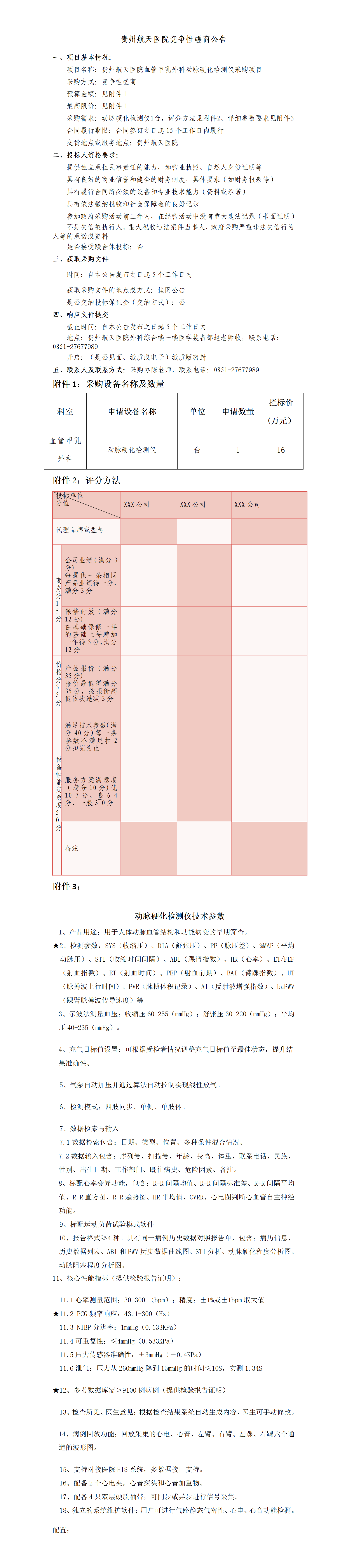 贵州航天医院血管甲乳外科动脉硬化检测仪采购项目竞争性磋商公告