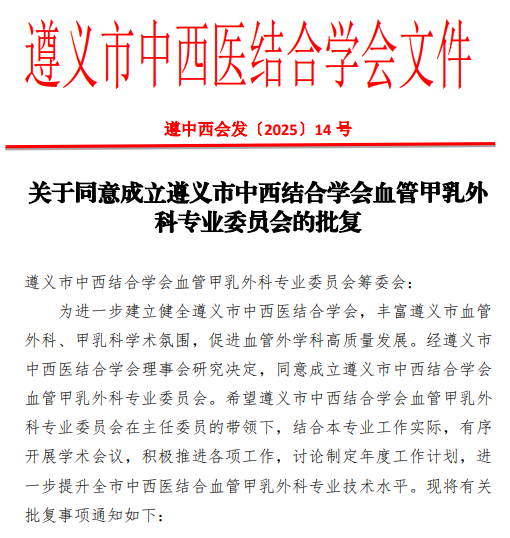 9月27日,由遵义市中西医结合学会主办,贵州航天医院承办的遵义市中西医结合学会血管甲乳外科专业委员会成立大会在遵圆满举办。 同济大学附属上海市第四人民医院景在平教授,遵义市中西医结合学会会长、贵州航天医院廖江荣教授、空军军医大学唐都医院赵华栋教授,遵义医科大学附属医院李涛浪教授,遵义医科大学第二附属医院曾峰教授、蔡铮教授、何思思教授,遵义市第一人民医院瞿锐教授,贵黔国际总医院杨新华教授、陈建清教授等专家出席会议;遵义市中西医结合学会会员、血管甲乳外科专业委员会候选委员及遵义市县级医疗机构血管甲乳外科医务人员代表参加会议。 遵义市中西医结合学会会长、贵州航天医院廖江荣致辞 遵义市中西医结合学会秘书长、贵州航天医院中医科主任娄会会发言并宣读批复文件 大会严格按照《遵义市中西医结合学会章程》,投票选举产生了第一届专委会名誉主任委员(3人)、主任委员(1人)、副主任委员(8人)、常务委员(23人)及委员(32人),并现场授牌和颁发聘书。 遵义市中西医结合学会 血管甲乳外科专业委员会授牌 名誉主任委员聘书颁发 名誉主任委员:上海市第四人民医院景在平教授,中国医科大学第一附属医院辛世杰教授,空军军医大学唐都医院赵华栋教授 主任委员聘书颁发 主任委员:贵州航天医院方军教授 副主任委员聘书颁发 副主任委员:遵义医科大学附属医院李涛浪教授,遵义医科大学第二附属医院曾峰教授、蔡铮教授、何思思教授,遵义市第一人民医院瞿锐教授,贵黔国际总医院杨新华教授、陈建清教授,贵州航天医院石国霰教授 专委会主任委员、贵州航天医院血管甲乳外科主任方军作表态发言 此次专委会的成立,不仅为遵义市中西医结合学会注入新的活力,也为推动区域中西医结合在血管甲乳外科领域的发展奠定了基础。未来,专委会将依托学会的资源优势,搭建“医、教、研、防”一体化平台,助力区域医疗高质量发展,为更多血管甲乳疾病患者提供优质、高效的医疗服务。 贵州航天医院 血管甲乳外科专家简介 方 军 血管甲乳外科主任、学科带头人,副教授,硕士研究生 从事本专业临床工作20余年,曾在空军医科大学(原第四军医大学)唐都医院普外科、第二军医大学长海医院血管外科工作及学习数年。 专业擅长:擅长主动脉支架置入介入主动脉夹层、下肢深静脉血栓置管溶栓术治疗深静脉血栓形成、颈动脉内膜剥脱术治疗颈动脉狭窄、Forgarty导管取栓治疗下肢动脉栓塞等技术,熟练操作甲状腺癌根治术、甲状腺部分切除术、甲状腺次全切除术、甲状腺良性肿瘤切除术、乳腺癌根治术、乳腺良性肿瘤切除术、单纯乳腺切除术、乳腺癌保乳手术;熟练掌握外科急危重病人主动脉夹层、布加综合征、主髂动脉闭塞症、股浅动脉闭塞症、急性下肢动脉栓塞、肺栓塞、复杂深静脉血栓等的救治;熟练掌握并独立完成血管外科主动脉支架置入介入治疗主动脉夹层、弓上杂交手术治疗复杂主动脉夹层、球囊扩张治疗布加综合征、腋双股人工血管搭桥治疗主髂动脉闭塞症、股胭搭桥治疗股浅动脉闭塞症、球囊扩张及支架置入治疗股浅动脉闭塞症、Forgarty导管取栓治疗急性下肢动脉栓塞、介入导管肺动脉置管溶栓治疗肺栓塞、球囊扩张加置溶栓治疗复杂深静脉血栓形成等技术操作。 贵州航天医院 血管甲乳外科简介 贵州航天医院血管甲乳外科是贵州航天医院重点发展科室之一,开放床位20余张。科室现已同海军军医大学(第二军医大学)长海医院血管外科、空军医科大学(原第四军医大学)唐都医院甲状腺乳腺外科形成联合诊疗模式,服务范围覆盖遵义市区及各县(市),切实为血管疾病患者健康保驾护航。 精品技术 (一)甲状腺良性肿瘤的热消融技术 应用范围:甲状腺良性结节、手术残留的结节或新生结节、复发的甲状腺恶性结节、瘢痕体质及美容要求者、儿童的甲状腺结节、准备受孕的女性甲状腺结节者。 技术优势:微创、精准、恢复快。 (二)腹主动脉瘤覆膜支架腔内隔绝术 应用范围:多种类型的腹主动脉瘤,如肾下腹主动脉瘤、髂总腹主动脉瘤等。 技术优势:创伤小、恢复快、并发症少。 (三)大隐静脉激光腔内闭合术 应用范围:轻至中度大隐静脉曲张。 技术优势:创伤小、恢复快、痛苦小。 (四)乳腺结节微创旋切术 应用范围:良性乳腺病变、可疑病灶活检、新辅助治疗后疗效判定。 技术优势:创伤小、恢复快、精准切除。 诊疗范围 糖尿病足治疗、胸腹主动脉瘤腔内治疗、静脉曲张微创治疗、下肢动脉硬化闭塞症微创治疗、下肢静脉血栓治疗、下肢血栓闭塞性脉管炎治疗,肾动脉狭窄治疗;甲状腺结节射频微创治疗、各种甲状腺良恶性肿瘤的外科及微创治疗;各种乳腺结节的微创治疗、各种乳腺良恶性肿瘤的外科及微创治疗。 End