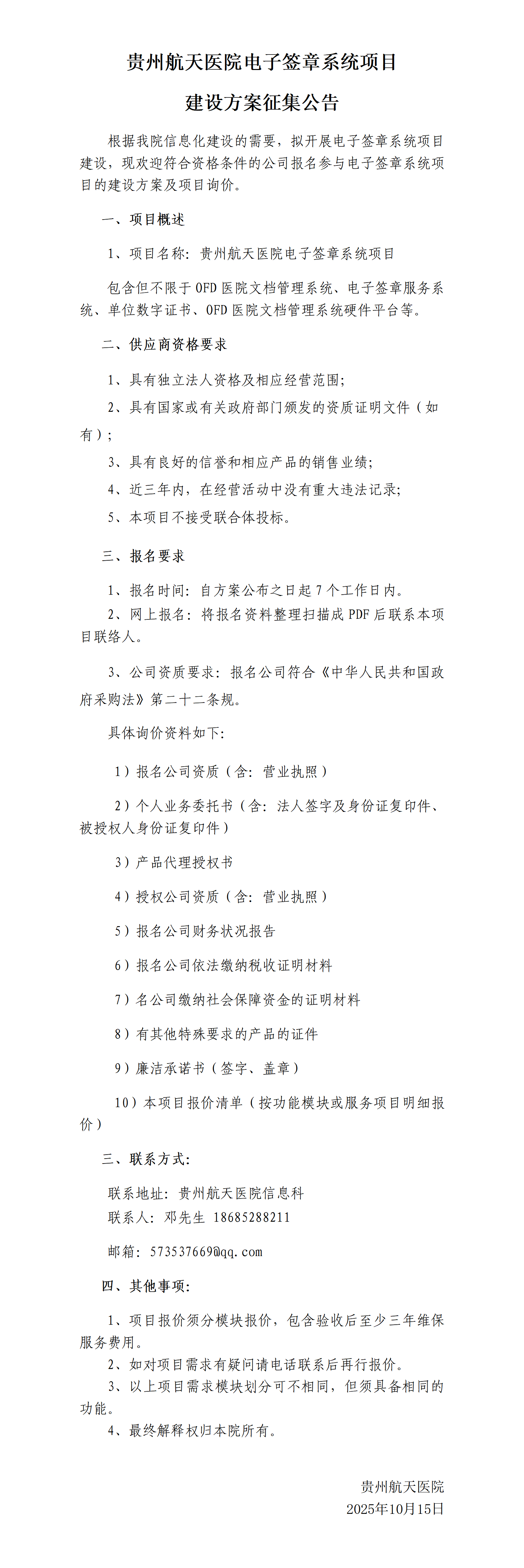 贵州航天医院电子签章系统项目建设方案征集公告