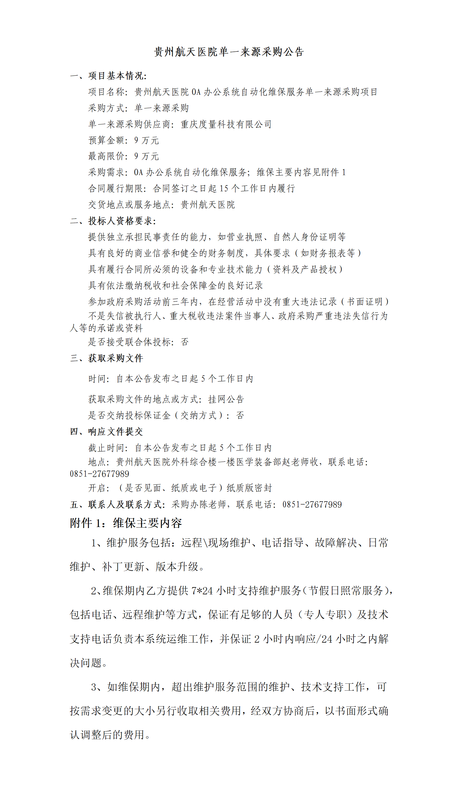贵州航天医院OA办公系统自动化维保服务单一来源采购项目公告
