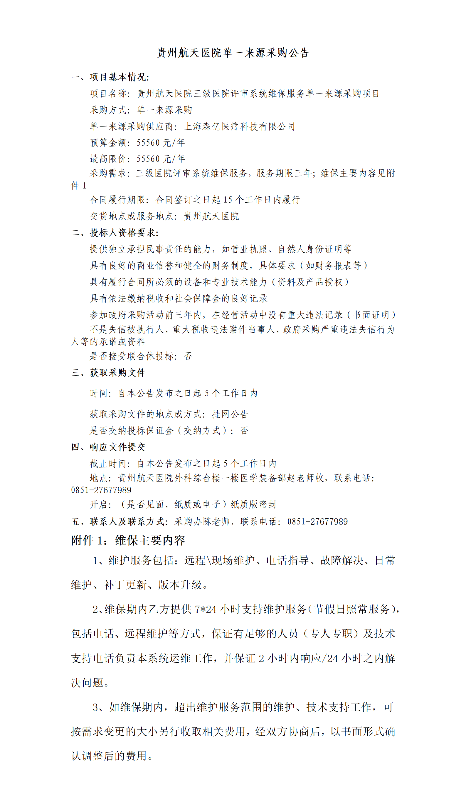 贵州航天医院三级医院评审系统维保服务单一来源采购项目公告
