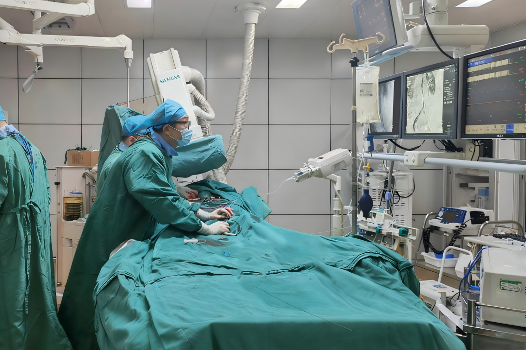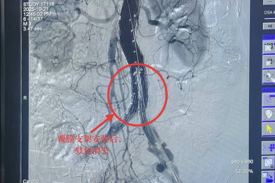 腹主动脉 是人体输送血液 的“主干道” 当这段血管壁 在血流长期冲击下 变得薄弱 就会像旧轮胎一样 局部膨出 形成“腹主动脉瘤” 值得注意的是,它虽然名字带“瘤”,却与恶性肿瘤完全不同,其真正的危险在于,瘤体在血流不断冲击下会逐渐增大、变薄,最终像“爆胎”一样突然破裂,引发致命性大出血。 案例分享 近日,我院血管甲乳外科团队成功为一位患者实施了“腹主动脉瘤覆膜支架腔内隔绝术”,通过这项微创技术为患者化解破裂风险,助力患者重获健康。 79岁的杨奶奶近期感觉腹部隐隐作痛,用手可以在肚子上摸到一个跳动的包块,便前往贵州航天医院血管甲乳外科就诊,完善腹部超声、血管造影等检查提示:腹主动脉瘤,直径达到33毫米,破裂的风险较高。考虑到杨奶奶患有冠心病、高血压、慢性肺部感染等慢性疾病,科室团队为其制定了“腹主动脉瘤覆膜支架腔内隔绝术”治疗方案。 手术仅用2小时,通过大腿根部两个约2厘米长的小口子,用一根细长的导丝把一个特殊的“带膜支架”像送伞一样,精准地送到血管“鼓包”的地方,支架打开后,就在血管内部搭起了一个坚固的“新通道”,把血流引导到正常的血管里,从而让脆弱的“鼓包”不再承受压力,解除了破裂的风险。术后复查,患者恢复良好,造影未见内漏。 科普小知识 腹主动脉瘤覆膜支架腔内隔绝术是将“带膜”的支架导入腹主动脉,类似于人工血管,膨胀后将腹主动脉瘤与血管腔隔绝,达到重建人工血管的目的,促使其逐渐机化、缩小,从而消除瘤体破裂、出血隐患,达到治疗目的。 技术优势 ☆切口小、无需开腹:仅需在双侧腹股沟区做约1-2厘米的小切口,作为覆膜支架的入路,避免传统手术大的腹部切口。 ☆组织损伤小:避免了对肠道、肝脏等腹腔脏器的扰动及开腹手术可能带来的切口疝、肠粘连等远期并发症。 ☆出血少、疼痛轻:不涉及主动脉的完全阻断和吻合,因此术中出血量通常少于开腹手术,对高龄、高危患者更具耐受性。 专家提示 贵州航天医院专家提示:腹主动脉瘤在老年群体,尤其是有高血压或动脉粥样硬化的朋友中更为常见,但它早期非常“隐蔽”,可能没有明显症状,因此,高危人群定期做一次腹部的血管超声检查,是关键的早筛早治方法。 日常生活中,也请记得“安抚”好血管:戒烟限酒、避免提重物、猛然发力、剧烈运动,保持大便通畅,尽量不要剧烈咳嗽或情绪过分激动,以防给腹腔内的血管增加意外压力。 部分图片来源于网络,仅用作健康科普知识分享,如有侵权,请联系删除。 贵州航天医院 血管甲乳外科专家简介 方 军 血管甲乳外科主任、学科带头人,副教授,硕士研究生 从事本专业临床工作20余年,曾在空军医科大学(原第四军医大学)唐都医院普外科、第二军医大学长海医院血管外科工作及学习数年。 专业擅长:擅长主动脉支架置入介入主动脉夹层、下肢深静脉血栓置管溶栓术治疗深静脉血栓形成、颈动脉内膜剥脱术治疗颈动脉狭窄、Forgarty导管取栓治疗下肢动脉栓塞等技术,熟练操作甲状腺癌根治术、甲状腺部分切除术、甲状腺次全切除术、甲状腺良性肿瘤切除术、乳腺癌根治术、乳腺良性肿瘤切除术、单纯乳腺切除术、乳腺癌保乳手术;熟练掌握外科急危重病人主动脉夹层、布加综合征、主髂动脉闭塞症、股浅动脉闭塞症、急性下肢动脉栓塞、肺栓塞、复杂深静脉血栓等的救治;熟练掌握并独立完成血管外科主动脉支架置入介入治疗主动脉夹层、弓上杂交手术治疗复杂主动脉夹层、球囊扩张治疗布加综合征、腋双股人工血管搭桥治疗主髂动脉闭塞症、股胭搭桥治疗股浅动脉闭塞症、球囊扩张及支架置入治疗股浅动脉闭塞症、Forgarty导管取栓治疗急性下肢动脉栓塞、介入导管肺动脉置管溶栓治疗肺栓塞、球囊扩张加置溶栓治疗复杂深静脉血栓形成等技术操作。 贵州航天医院 血管甲乳外科简介 贵州航天医院血管甲乳外科是贵州航天医院重点发展科室之一,由12名医护专业团队组成,开放床位20余张。科室现已同海军军医大学(原第二军医大学)、上海长海医院血管外科、空军医科大学(原第四军医大学)唐都医院甲状腺乳腺外科形成联合诊疗模式,服务范围覆盖遵义市区及各县(市),切实为血管疾病患者健康保驾护航。 精品技术 (一)甲状腺良性肿瘤的热消融技术 应用范围:甲状腺良性结节、手术残留的结节或新生结节、复发的甲状腺恶性结节、瘢痕体质及美容要求者、儿童的甲状腺结节、准备受孕的女性甲状腺结节者。 技术优势:微创、精准、恢复快。 (二)腹主动脉瘤覆膜支架腔内隔绝术 应用范围:多种类型的腹主动脉瘤,如肾下腹主动脉瘤、髂总腹主动脉瘤等。 技术优势:创伤小、恢复快、并发症少。 (三)大隐静脉激光腔内闭合术 应用范围:轻至中度大隐静脉曲张。 技术优势:创伤小、恢复快、痛苦小。 (四)乳腺结节微创旋切术 应用范围:良性乳腺病变、可疑病灶活检、新辅助治疗后疗效判定。 技术优势:创伤小、恢复快、精准切除。 诊疗范围 糖尿病足治疗、胸腹主动脉瘤腔内治疗、静脉曲张微创治疗、下肢动脉硬化闭塞症微创治疗、下肢静脉血栓治疗、下肢血栓闭塞性脉管炎治疗,肾动脉狭窄治疗;甲状腺结节射频微创治疗、各种甲状腺良恶性肿瘤的外科及微创治疗;各种乳腺结节的微创治疗、各种乳腺良恶性肿瘤的外科及微创治疗