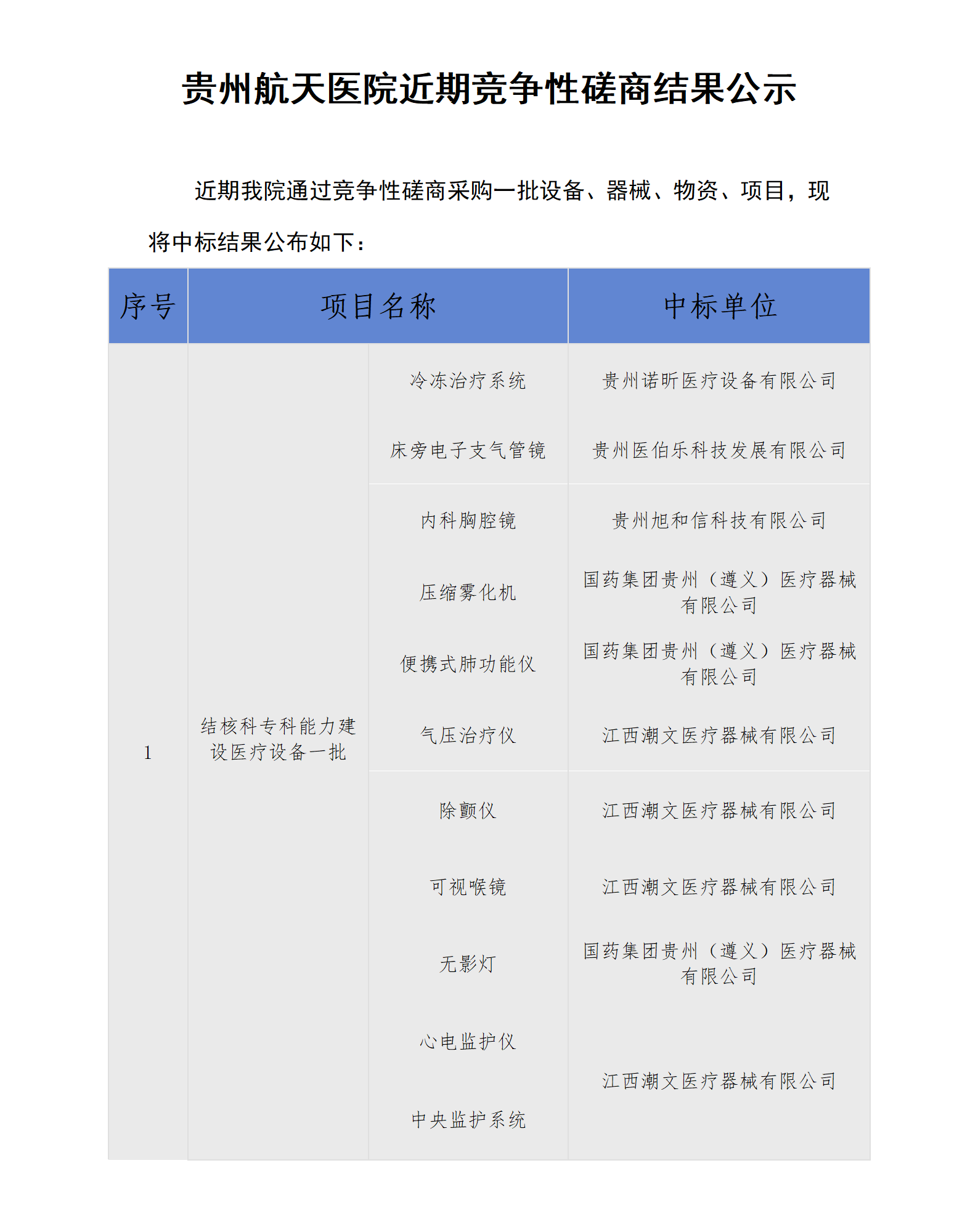 贵州航天医院近期竞争性磋商及单一来源采购结果公示