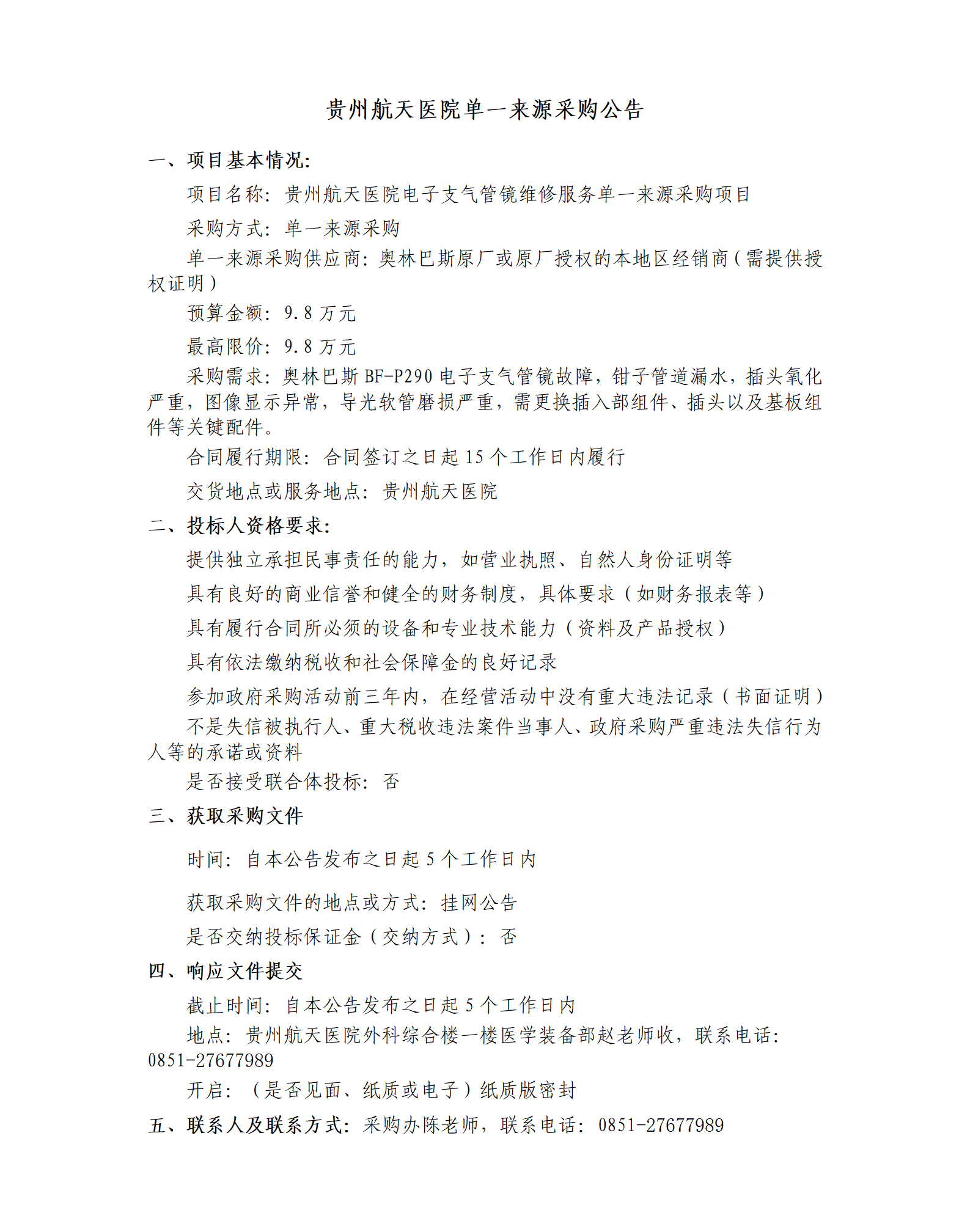 贵州航天医院电子支气管镜维修服务单一来源采购项目公告