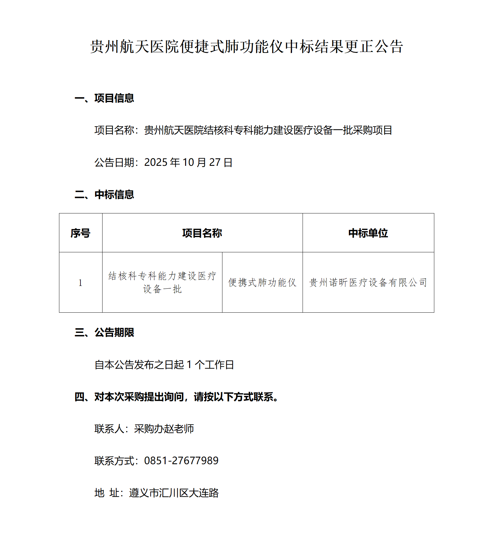 贵州航天医院便捷式肺功能仪中标结果更正公告