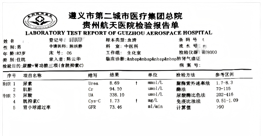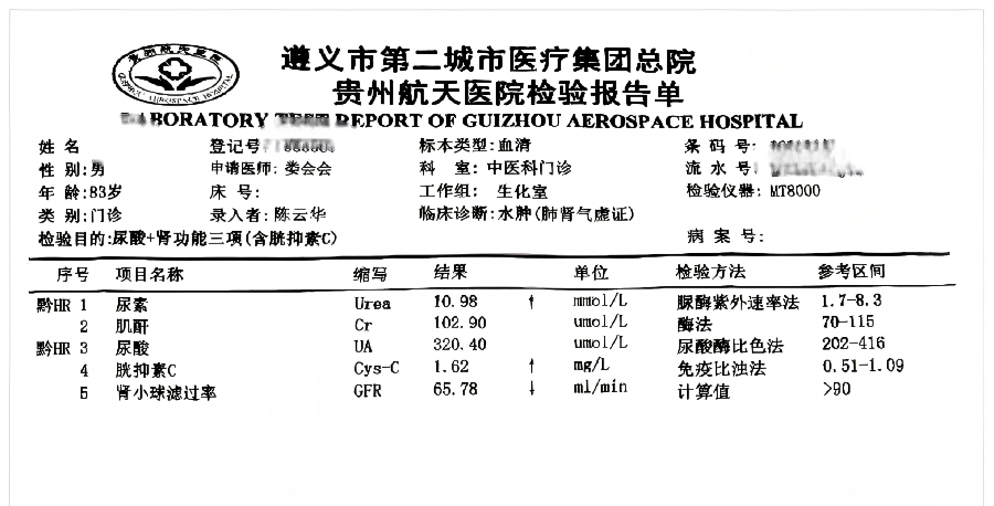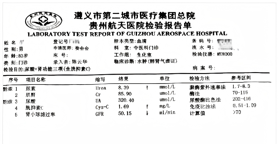 您是否长期感到 莫名的疲惫 即使休息也难以缓解 脚踝或小腿浮肿 按压后凹陷久久不回弹 夜间小便次数增多 影响睡眠质量 这些看似常见的小问题 都可能是身体“净水系统” 肾脏发出的警报! 案例分享 近期,贵州航天医院中医科接诊一位年过八旬的患者,患高血压多年,慢性肾衰竭,并伴有双腿浮肿、畏寒乏力、夜尿频繁,西医检查提示其肾功能已明显下降。 在坚持基础治疗的同时,中医科根据其舌苔白腻、手脚冰凉等表现,采用“温阳利水”为主的思路进行中药调理。经过一段时间的系统调理,患者怕冷、浮肿等情况显著缓解,复查显示相关肾功能指标也有所改善。 用药前报告显示 用药1月后报告显示 用药2月后报告显示 肾脏告急 危害不容小觑 我们的肾脏,就像身体里一对精密的“滤网”和“平衡器”,每天默默地过滤血液、排出废物、调节水分和血压,而慢性肾衰竭,简单来说就是“滤网”的功能因各种原因(如长期高血压、糖尿病等)出现了减退,早期可能仅有乏力、浮肿等不起眼的信号,但若长期不加干预, 肾功能持续下降,不仅会严重影响日常生活,还可能逐渐引发心血管问题等一系列全身性危害。 中医辅助调理:“温阳利水” 针对部分慢性肾衰竭患者,中医在规范治疗基础上,采用“温阳利水法”进行辅助调理,通过运用特定中药提升身体阳气,增强水液代谢的动力,帮助把多余的水湿排出去,缓解相关症状,这好比为运转乏力的工厂补充能量、疏通渠道,从而为肾功能保护提供一条辅助路径。该方法需要先准确辨别每个人的体质和症状,再进行针对性调理,务必在专业中医师指导下使用,不可一概而论。 日常护肾,中医有妙招: 结合中医养生智慧,建议日常注意: ✔饮食温和:适量食用山药、莲子、芡实等平补食材,严格控盐,避免生冷油腻。 ✔保暖节律:避免腰腹部受凉,规律作息,不要熬夜。 ✔和缓运动:练习八段锦、太极拳,其中“两手攀足固肾腰”式有助舒缓腰部。 ✔常按两穴:每日按揉太溪穴(内踝与跟腱间凹陷)、涌泉穴(足底前部凹陷)各3-5分钟。 ✔规范管理:患者务必遵医嘱定期复查,控制好血压、血糖等基础病,中医药调理可与现代医学治疗相辅相成。 慢性肾衰的预防和控制,重点在于早关注、长期坚持调理。中医药在缓解身体不适、提高生活质量上特色突出,关键是要准确判断病症、中西医结合、坚持调养。让我们用科学的方法,一起保护好肾脏这个生命的重要器官。 【温馨提示】本文仅为健康科普,不替代任何专业诊疗建议,具体用药请务必咨询专业医师。 注:部分图片来源于网络,如有侵权,请联系删除。 贵州航天医院中医科专家简介 李思德 中医科特聘专家,遵义市名中医 专业擅长:从医五十载,擅长治疗多种疑难杂症、常见病、多发病、地方病,尤其对肝肾心脑部疾病、胆结石,泌尿系结石、急慢性肝炎、中风瘫痪、眩晕、胆道蛔虫、肿瘤、男女不孕育等疾病,海内外求医者络绎不绝,深受社会好评。 遵义市第十一届人大代表,汇川区第一届至第三届政协委员,少年时拜四川名老中医张华老师门下学医,1969年下乡当知青兼赤脚医生,1984年9月起就读于北京中医刊授学院(卫生部主办)。1988年8月16日创办遵义市中草医院,任法人、负责人,1989年11月医院更名为思德诊疗所,2005年1月再次更名为思德综合门诊。他继承和发扬传统医学,对医学勤学好研,对患者如亲人,运用传统医学理论,辩证论治,理法方药,道地药材,依古炮制,服务于社会,并载入《健康中国之大医精诚》和《中华优秀人物大典》书籍。 娄会会 中共党员,中医科主任,副主任医师 专业擅长:运用中医辨证施治治疗中医杂病、中医儿科、中医内科、中医男科、中医妇科、中医皮肤科等相关疾病,熟练针灸埋线治疗颈肩腰腿疼、肥胖等疾病,在小儿推拿治疗小儿肌性斜颈、先天性髋关节发育不良、遗尿、消化不良、腹痛、腹泻、感冒等小儿常见病多发病有独到的见解。 中国中医药研究促进会仲景医学研究分会常务委员,中华中医药学会少儿推拿传承发展共同体常务委员,中国中医药信息学会食疗分会理事, 中华中医药学会整脊分会委员会第五届青年委员,中国中药协会中医适宜技术专业委员会委员,贵州省针灸学会理事,贵州省针灸学会火针专业委会常务委员,遵义市中医药学会理事,遵义市中医药学会针灸专业委员会副主任委员,遵义市中西医结合学会秘书长。 贵州航天医院中医科简介 贵州航天医院中医科病房位于外科综合楼16楼,开放床位10张,实际床位30张,病房配套设施完善,采用新中式装修风格,温馨舒适,布局合理。科室共有医师、护士16名,拥有较好的临床经验。 中医科主要开展了中药、针灸、针刀、成人推拿、小儿推拿、拔罐、刮痧、穴位贴敷、耳针、埋线、药棒按摩治疗、中药熏蒸、中药足浴等传统中医药特色疗法。 拥有经颅磁治疗仪、盆底磁治疗仪、智能中医灸疗床、超声波治疗仪、短波治疗仪、中频治疗仪、经皮神经电刺激仪、深筋膜刺激仪等现代康复治疗仪器设备,形成了以中西医结合诊疗为特色的综合诊疗模式。 ✦✦ 对中医内、外、妇、儿常见病多发病,在疑难杂症的诊断、治疗上有较丰富的诊疗经验,且能达到较满意的临床效果,目前科室开展业务如下: 1.中医内科:咳嗽、哮喘、肺痨、失眠、呕吐、便秘、腹痛、腹泻、黄疸、心悸、胸痹、眩晕、虚劳、