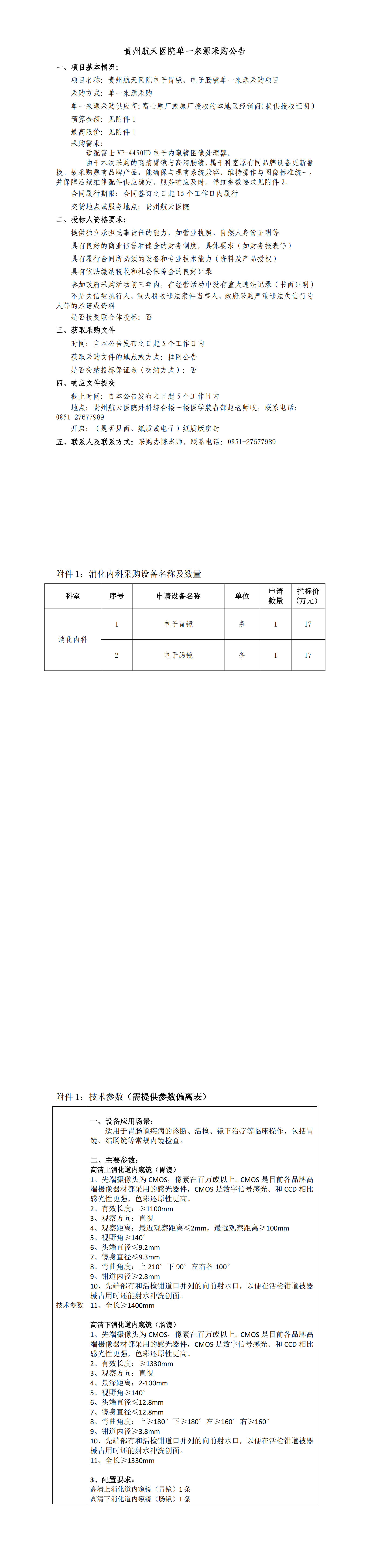 贵州航天医院电子胃镜、电子肠镜单一来源采购项目公告