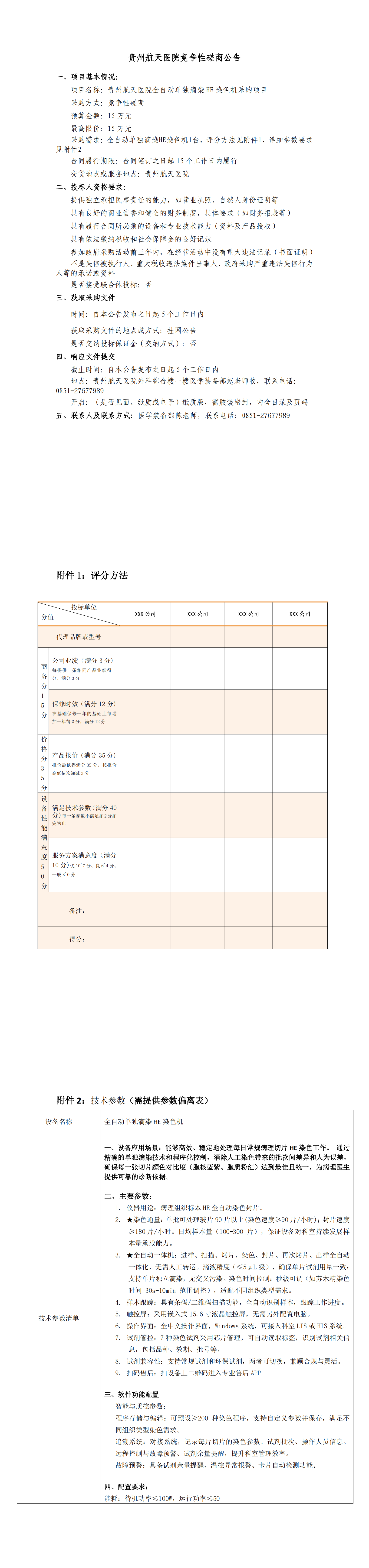 贵州航天医院全自动单独滴染HE染色机采购项目竞争性磋商公告