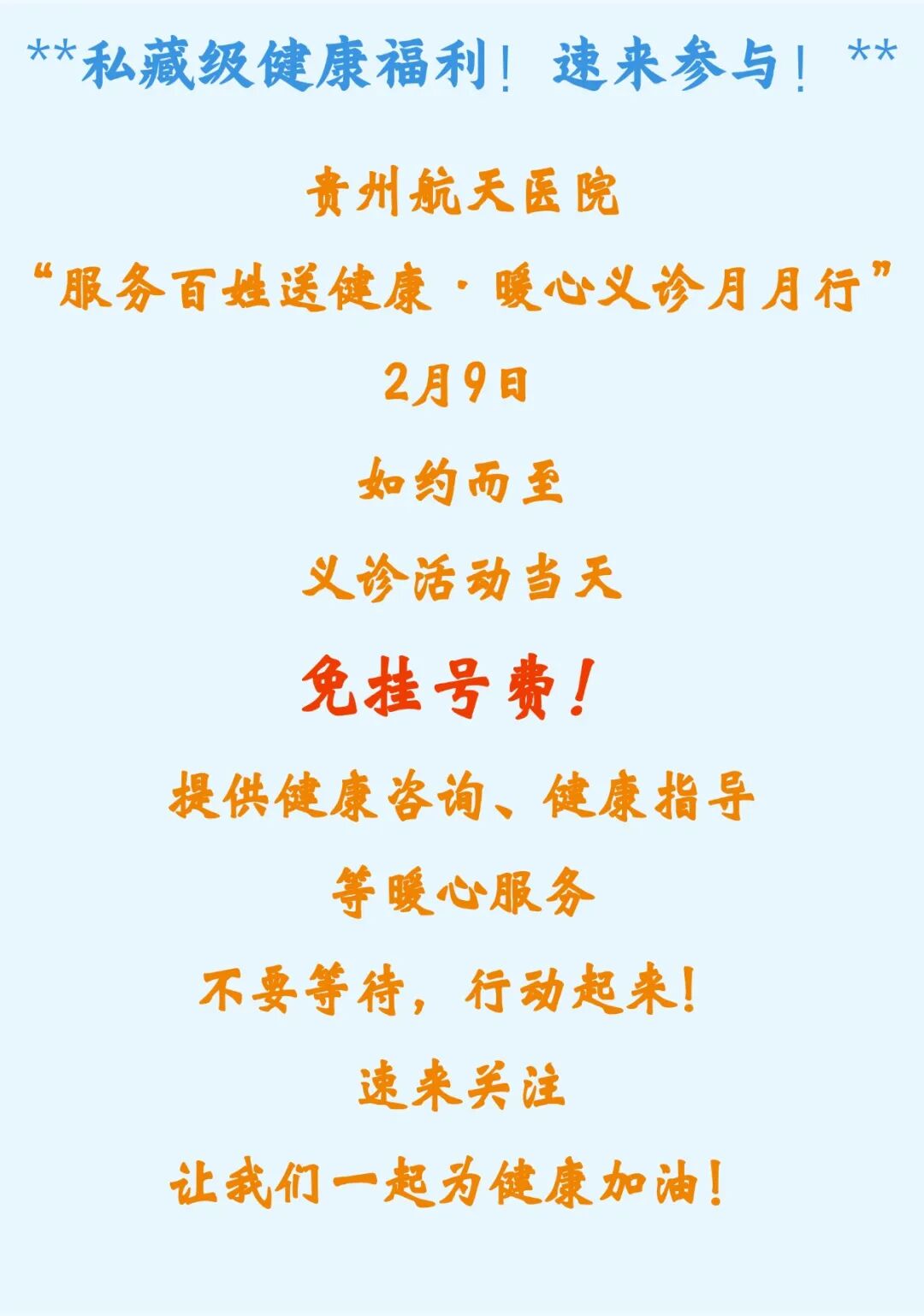 义诊时间 时 间:2026年2月9日(周一) 上 午:08:00——12:00 下 午:13:00——17:00 义诊地点 贵州航天医院门诊部 义诊团队 本次义诊汇聚了呼吸内科、骨科、神经内科、泌尿外科、血管甲乳外科、全科医学科、儿科、妇科、产科、消化内科、普外科、皮肤科、眼科、口腔科、临床营养科等27个科室专家 义诊内容 1.本次义诊免挂号费(挂号单只限当日使用,过期作废)。 2.免费进行相关疾病咨询、初筛、诊断和用药指导。 就诊必读 1.请携带身份证或医保卡至自助挂号缴费机或门诊收费处进行现场挂号,也可以关注贵州航天医院微信公众号预约挂号。 2.请按照挂号顺序有序就诊。 3.有既往病史的患者请带好半年内相关检查报告。 义诊科室及专家介绍 神经内科:呼吸综合楼004诊室 石国霰 九三学社社员,神经内科主任,主任医师 临床擅长:从事神经疾病临床诊治工作30多年,对脑血管病、癫痫、神经系统感染性疾病、变性疾病、神经系统免疫性疾病、神经遗传性疾病的诊治具有丰富的临床经验。 北京神经内科学会全科医学委员会常务委员,北京神经内科学会委员,第二届中国研究型医院学会眩晕医学专业委员会常务委员,首届中华自愿者协会-中西医结合学会-神经病学组委员,贵州省医学会神经介入分会常委,遵义市医疗质控中心副主任委员,贵州省脑卒中防治专业委员会委员,贵州省医学会神经康复医学分会委员,贵州省医学会遵义市神经疾病分会副主任委员,贵州省健康科普专家,遵义市健康科普专家。 肾脏风湿科:门诊综合楼109诊室 王卫华 肾脏风湿科主任医师 临床擅长:从事临床工作28年,擅长尿毒症患者血管通路的建设及维护(如标准和高位动静脉内瘘术、取栓+内瘘重建术、内瘘狭窄球囊扩张术、长期中心静脉置管术及肾穿刺活检术)等手术,对原发性和继发性肾病综合征、急、慢性肾小球肾炎、慢性肾脏病、泌尿系感染、结缔组织病、急性中毒、痛风、贫血、血小板减少症等疾病诊治及血液透析技术应用等具有丰富的临床经验。 1995年毕业于遵义医学院临床医学系,曾前往重庆医科大学进修学习肾脏疾病及血液净化,遵义市医学会肾脏病学分会常务委员,遵义市血液净化质量控制中心委员,先后发表肾病专业省部级医学刊物医学论文8篇,主持市级科研项目2项。 儿科发热门诊:发热门诊楼1楼 黄仕辉 中共党员,儿科主任医师 临床擅长:擅长儿科常见病和儿童心因性疾病及多发病诊治,对儿童呼吸系统、消化系统、神经系统疾病及儿童传染病的诊治具有丰富的临床经验,其中包括儿童哮喘、重症肺炎、各种腹泻病、颅内感染、儿童结核病、重症手足口病等疾病。 1991年毕业于遵义医学院临床医学系,1995年赴重庆儿童医院进修学习;是遵义市儿科医疗质控中心副主任委员、遵义市医疗事故鉴定专家组成员;多次参加省内外儿科学术交流,发表论文20篇,包括省部级论文、北大核心和论著,主持、参与并完成科研课题2项。 消化内科:门诊综合楼112诊室 龚明素 九三学社社员,消化内科主任,副主任医师 临床擅长:从事临床及内镜工作17年,对消化道早癌、消化道出血、幽门螺旋杆菌(HP)感染、萎缩性胃炎、消化道息肉、消化道粘膜下肿瘤、肠结核、胃食管反流病、胰腺炎、肝硬化、肝功能异常等消化系统疾病的诊治有丰富的临床经验;擅长胃肠镜诊断、胃肠道息肉内镜下切除术(EMR)、消化道早癌粘膜剥离术(ESD)、黏膜下肿瘤切除术(ESE)、消化道异物取出术、急诊内镜止血术、静脉曲张套扎(EVL)及硬化术(ELS)、内镜下痔疮套扎及硬化治疗等内镜诊疗技术。 曾在重庆西南医院及上海市瑞金医院消化内科及消化内镜中心进修学习,遵义医药高等专科学校聘任副教授,贵州省医学会消化病学分会委员,贵州省医学会消化病学分会肝胆胰学组委员,贵州省医学会消化病学分会IBD学组委员,贵州省医学会消化病学分会胃酸相关性疾病学组委员;贵州省医学会消化病学会胃肠功能及动力性疾病学组委员,遵义市医学会消化病学分会常委,遵义市中西医结合学会会员,遵义市中西医结合学会消化专委会副主任委员。发表SCI 1篇,核心期刊1篇,省部级期刊10余篇,专著1部,主持并完成科研3项,专利3项。 骨二科:门诊综合楼107诊室 瞿 晖 骨科党支部书记,骨二科主任,副主任医师 临床擅长:对骨科的常见病、关节外科、脊柱外科及运动医学疾病的诊治具有丰富的临床经验,熟练掌握骨科手术操作技术。 毕业于遵义医学院临床医学系,2005年前往广州中山大学第一附院骨显微医学部进修学习,2011年前往成都华西医院进修学习,并多次在省内外学习骨科相关知识,是中华医学会骨科分会会员。 儿科:门诊综合楼217诊室 游德敏 中共党员,儿科主任,副主任医师 临床擅长:从事儿科工作约20年,擅长儿科常见病及多发病的诊治,对儿科急危重症如呼吸循环衰竭、重度脱水、惊厥持续状态、哮喘持续状态、重症手足口病和儿童肺结核、结核感染、结核性脑膜炎的诊治有丰富的临床经验。 曾前往上海交通大学附属新华医院进修学习;是遵义市院前医疗急救专家,遵义市预防接种异常反应调查诊断专家组成员;发表论文数篇,主持完成新技术新项目1项,获得实用新型发明专利3项。 耳鼻咽喉科:门诊综合楼3楼 张光进 中共党员,耳鼻咽喉科主任,副主任医师 临床擅长:对耳鼻喉头颈常见病的诊治具有丰富的临床经验,擅