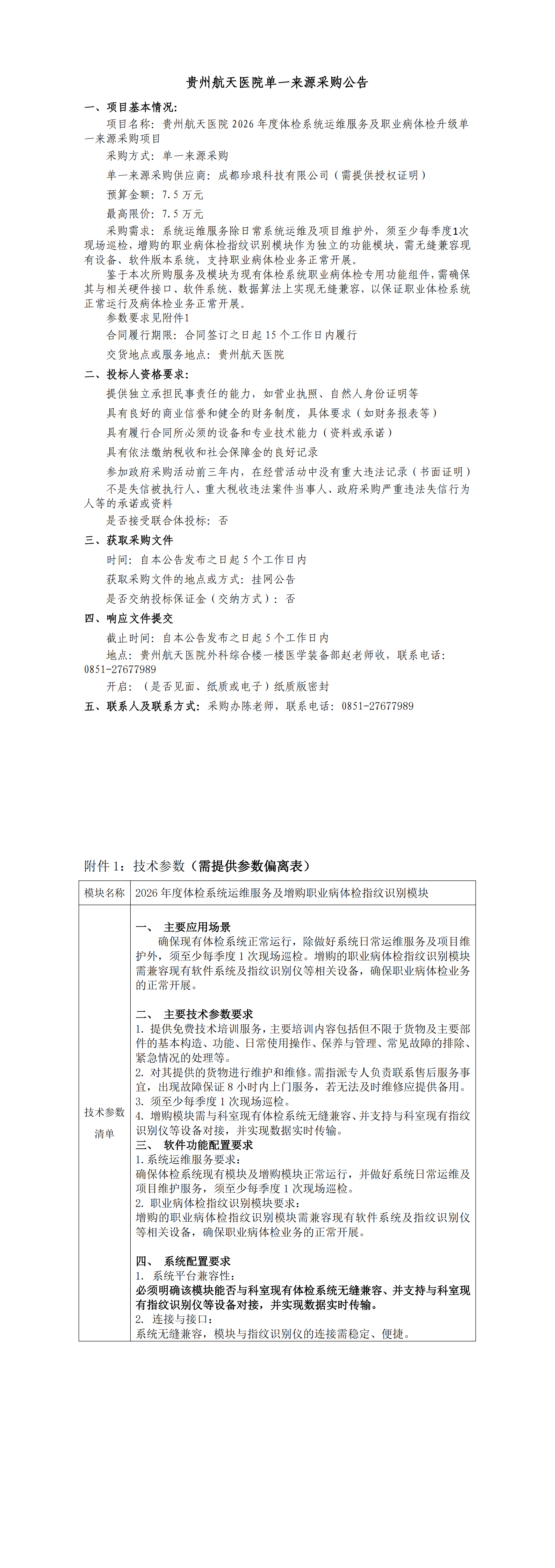 贵州航天医院2026年度体检系统运维服务及职业病体检升级单一来源采购项目公告