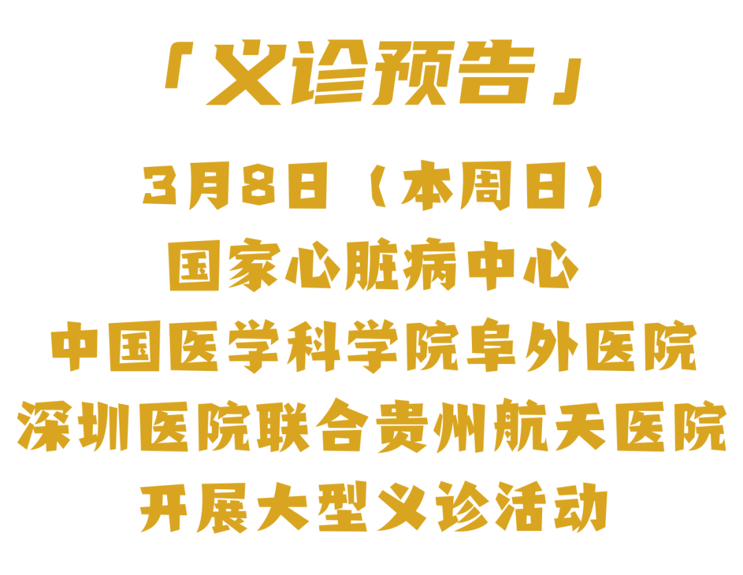 为促进优质医疗资源下沉,进一步推动医疗技术交流,让市民在家门口就能享受到高水平的诊疗服务,3月8日(周日)上午,国家心脏病中心&中国医学科学院阜外医院深圳医院专家团队将联合贵州航天医院开展大型义诊活动,欢迎广大市民朋友前来咨询和问诊! 义诊信息 义诊时间:2026年3月8日(周日)上午8:30开始 义诊地点:贵州航天医院门诊部一楼大厅 义诊内容 1.免费测量血压、血糖、心率。 2.心血管系统疾病(如冠心病、房颤、心衰、心律失常、高血压、结构性心脏病等)免费问诊、用药指导与健康宣教。 温馨提示 1.有既往病史的患者请带好相关检查报告(如CT、X光片、化验单等),方便专家全面了解病情。 2.冬春交替是心血管疾病高发期,欢迎广大市民前来咨询问诊,早筛早诊、防患未然。 3.义诊无需预约,免挂号费,请现场有序排队就诊。 学术讲座及手术指导 义诊当天,刘俊教授一行还将在我院心血管内科进行复杂心律失常等介入手术指导,并开展学术讲座,分享中国医学科学院阜外医院深圳医院的先进临床经验与学科管理模式,为我院心血管内科高质量发展注入强劲动能! 刘俊教授作为我院心血管内科学科带头人,将常态化来院开展技术指导,协助优化日常诊疗流程、开展复杂病例会诊及高难度手术指导。未来,随着双方合作的持续深化,遵义地区患者将在家门口享受到国家级、可持续的高水平心血管诊疗服务。 义诊专家简介 刘 俊 国家心脏病中心&中国医学科学院阜外医院心血管内科主任医师,心律失常中心执行主任兼心律失常一病区主任,清华大学医学部&北京协和医学院心内科学医学博士,德国心脏病中心(柏林)访问学者,丹麦奥胡斯大学医院短期访问学者,贵州航天医院心血管内科学科带头人 专业擅长:复杂、复发性心律失常(室上速、房颤、房速、室早、室速)的诊断和介入治疗(包括 三维标测系统Carto3/Ensite/心内超声导管指导的射频消融与冷冻消融、经皮左心耳介入封堵术)等。 学术任职:中国医疗保健国际交流会心律与心电分会第一届、第二届委员、第三届常务委员兼任秘书长,中华医学会心电生理与起搏分会第一届心电生理和起搏创新工作委员会委员兼秘书,中华医学会心电生理与起搏分会第八届委员会心电专业学组成员,中国生物医学工程学会心律分会第十届、十一届青年委员,家卫健委心血管疾病介入诊疗技术心律失常介入培训导师(导管消融+器械植入),《中国心血管病研究》杂志青年编委会委员,《中国心脏起搏与心电生理杂志》特约审稿人。 参与撰写著作9部、横向课题5项、纵向课题6 项,以第一作者、通讯作者发表文章64篇,其中SCI期刊文章15篇,署名文章共110 篇。 陈琳琳 中国医学科学院阜外医院深圳医院麻醉科副主任医师,麻醉学博士在读,硕士毕业于哈尔滨医科大学 学术任职:中国心胸血管麻醉学会急救与复苏分会委员,中国心胸血管麻醉学会心血管麻醉分会青年委员。 主持吴阶平医学基金一项、院内自主课题一项,在Molecular.Medicine.Reports,Journal.of.Evaluation.in.Clinical.Practice等期刊上发表SCI论文三篇,中文核心期刊数篇,主编论著2部。 邹春霞 中国医学科学院阜外医院深圳医院副主任医师 专业擅长:长期从事心血管内科疾病的临床和科研工作,有十余年的心血管内科住院病房和门诊临床工作经验,具备扎实的心内科基础知识和临床技能,能熟练诊治心血管内科常见疾病,包括心律失常、冠心病、高血压、心力衰竭等;接受国家卫生部临床心脏起搏和电生理介入培训,目前主攻心律失常介入诊疗、起搏器植入与术后各种类型起搏器程控随访、心力衰竭、晕厥查因等。 学术任职:广东省医学会心脏起搏与电生理学青委会委员,广东省女医师协会心电学与起搏电生理专业委员会委员,深圳市医学会心电生理和起搏专业委员会委员/秘书。 主持完成市级临床课题,发表在国家核心期刊论文多篇。 张 雪 中国医学科学院阜外医院深圳医院主治医师,中南大学湘雅医学院临床医学本硕连读七年制(2001-2008年,学士、硕士) 专业擅长:擅长冠心病、高血压、心律失常、心力衰竭、心肌病等各种心血管疾病诊治,熟练掌握各种心血管疾病无创检查诊疗技术,在心脏康复治疗方面有丰富经验。 学术任职:现担任深圳市医学会心电生理和起搏专业委员会委员,深圳市医学会心脏康复专业委员会学术秘书。 主持市级科研项目1项,发表文章5篇,参编出版书籍4部,申请专利2项。 沈万贵 心内科党支部书记、主任,副主任医师 专业擅长:从事临床工作约33年,对冠心病,高血压病,各种心肌病等疾病的诊治以及内科疑难杂症疾病的诊疗具有丰富诊疗经验,累计实施冠心病、外周血管等疾病的介入手术诊疗过万例。擅长于冠脉复杂病变的介入手术治疗、肾动脉狭窄介入手术、下肢深静脉血栓的介入手术治疗。 学术任职:贵州省医学会心血管病分会常务委员、贵州省心脏病康复医学会常务委员,遵义市医学会心血管病分会副主任委员,西南高血压病管理委员会常务理事,贵州省冠心病组委员;发表学术论文20余篇。 张羽坤 中共党员,心血管内科副主任,主任医师,硕士研究生 专业擅长:具备心血管疾病心律失常介入(导管消融及植入器械)国家级手术资质,参与各类心脏介入手术6000余例。以第一作者在国内核心期刊发表医学论文10余篇,主持市级科研项目1项。 曾先后前往贵州省人